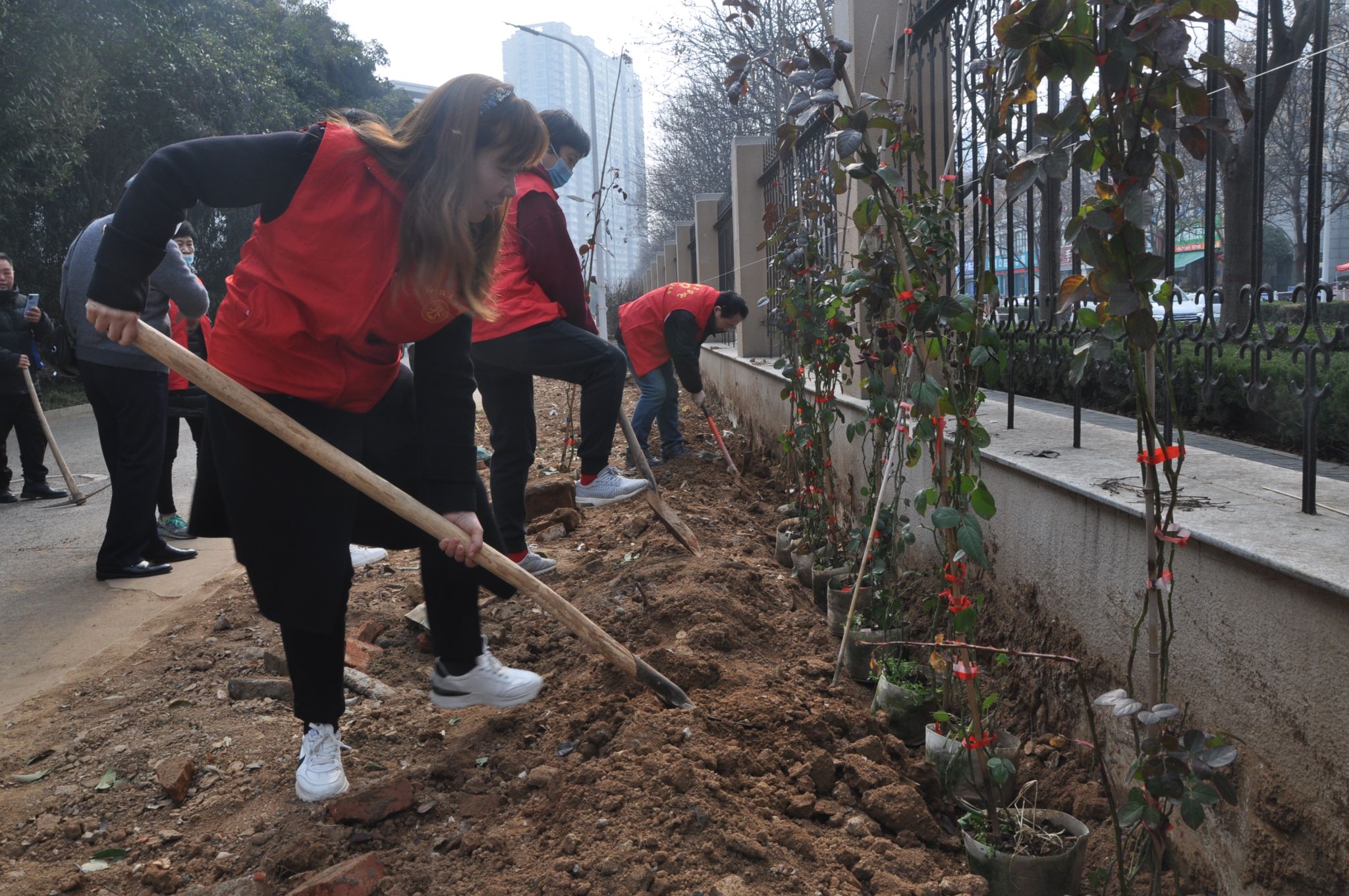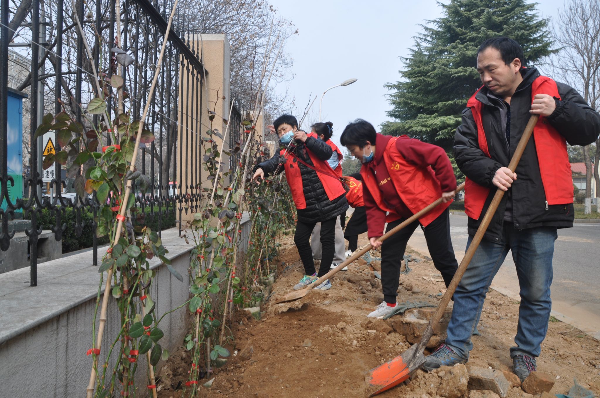 在种植月季活动现场,绿化师傅现场教学,让参加劳动的党员们查看土壤情况:并着重介绍了挖土深度、栽花间距以及浇水注意事项等知识。在劳动过程中,大家相互配合,有的挖沟,有的搬苗,有的填夯,有的灌溉……个个热情饱满、干劲十足,挥锹铲土,齐心协力种植着一株株苗木。当看到一排排错落有致的月季填补了此处裸露的黄土,新栽的苗木在春风中傲然挺立,焕发着勃勃生机,描摹着美丽校园的“工笔画”,党员们的脸上洋溢出幸福的微笑。相信再过一些时日,待花开时节,这里一定是校园新增的网红打卡地。