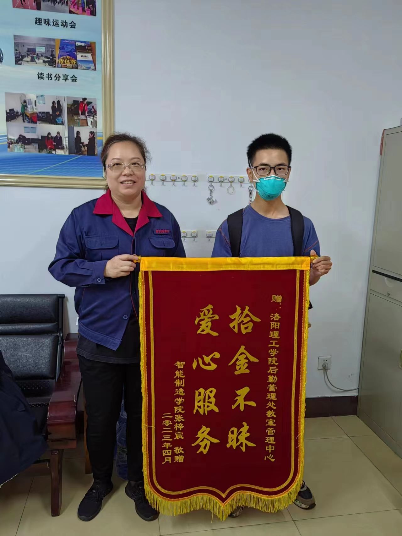 “阿姨!真是太感谢您了,这台电脑对我来说太重要了,里面有我的学习内容资料,笔记本丢失的这些天我很郁闷,我以为找不到了,没有想到在你们这里保存着,太感谢您们了!”5月5日,智能制造美高梅娱乐场 张梓宸同学手捧着一面锦旗送到了后勤管理处物业中心教室部公共教学楼值班室激动地说。拿到失而复得的笔记本,张梓宸同学脸上露出了难以抑制的喜悦之情。
