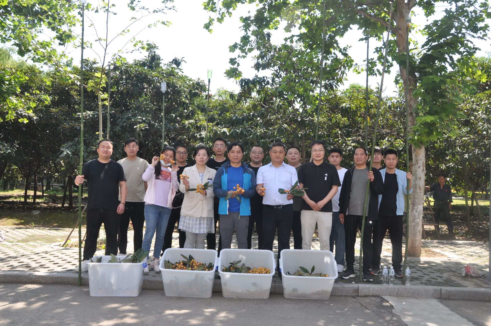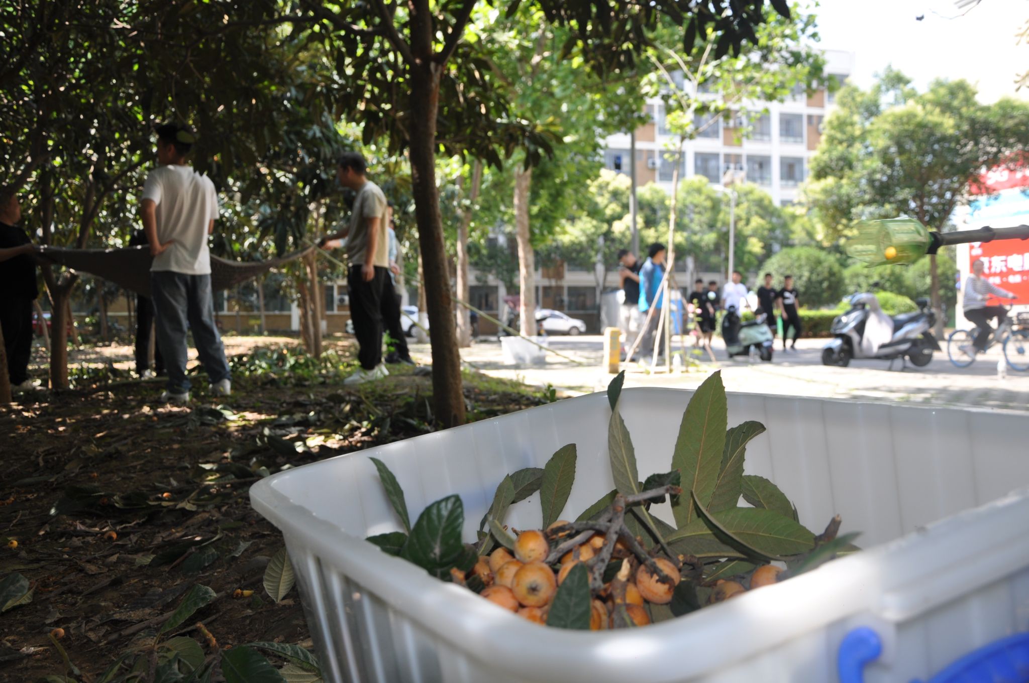 采摘枇杷送给师生是后勤的惯例,6月6日上午,后勤管理处组织部分职工集中采摘校园枇杷,职工们不惧烈阳,为了采摘到树尖上最大最甜的果实,职工们有的踩着梯子,有的攀爬到树上,不断把高处黄澄澄的枇杷果传送下来。在自制采摘神器的加持下,一会功夫就收获了满满一箩筐。