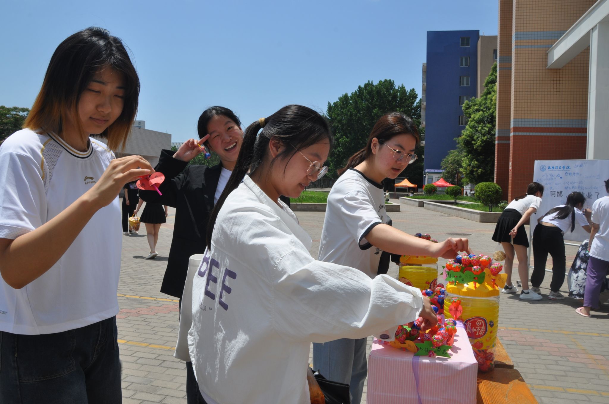 11点,一群群顺利毕业的同学们拥入到活动现场,他们有的脸上洋溢着收获的幸福和喜悦、有的脸上流露出离别的愁绪,“来选一颗写满祝福的毕业糖果吧”、“要毕业了,给阿姨说说心里话吧”、“来乖,拥抱一下吧”、“毕业快乐”、“谢谢阿姨”现场温暖甜蜜。