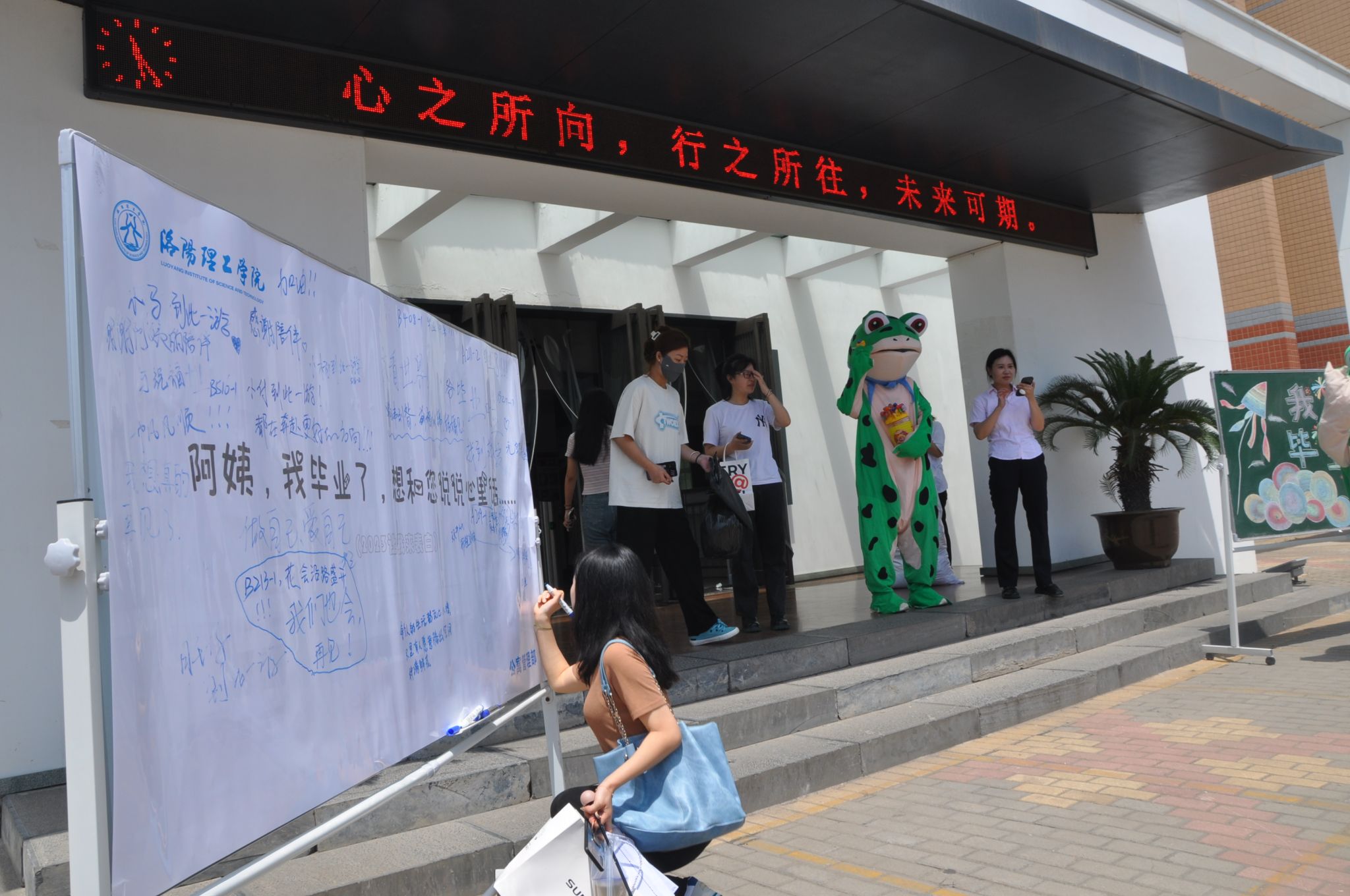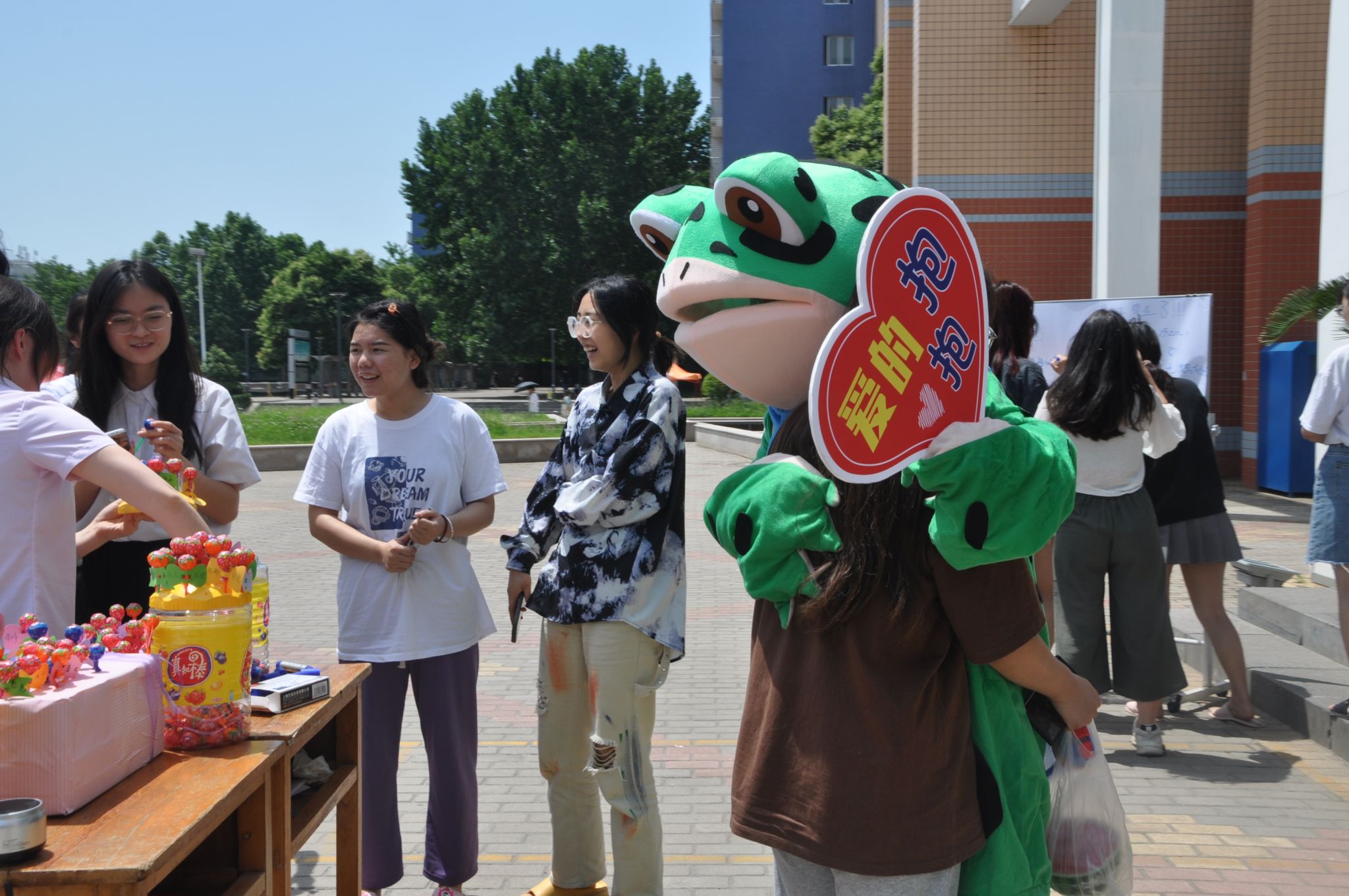 相见时难别亦难。6月5日上午10点半,王城校区致实书院门前的广场上,早早来了一群宿舍阿姨,他们穿着可爱的蛙蛙人偶,手捧彩色且写满祝福的糖果、高举“爱的拥抱”“生活点滴,铭记于心”标牌,唱着《一路顺风》离别歌等,等待着毕业典礼后手拿毕业证回家的孩子们。