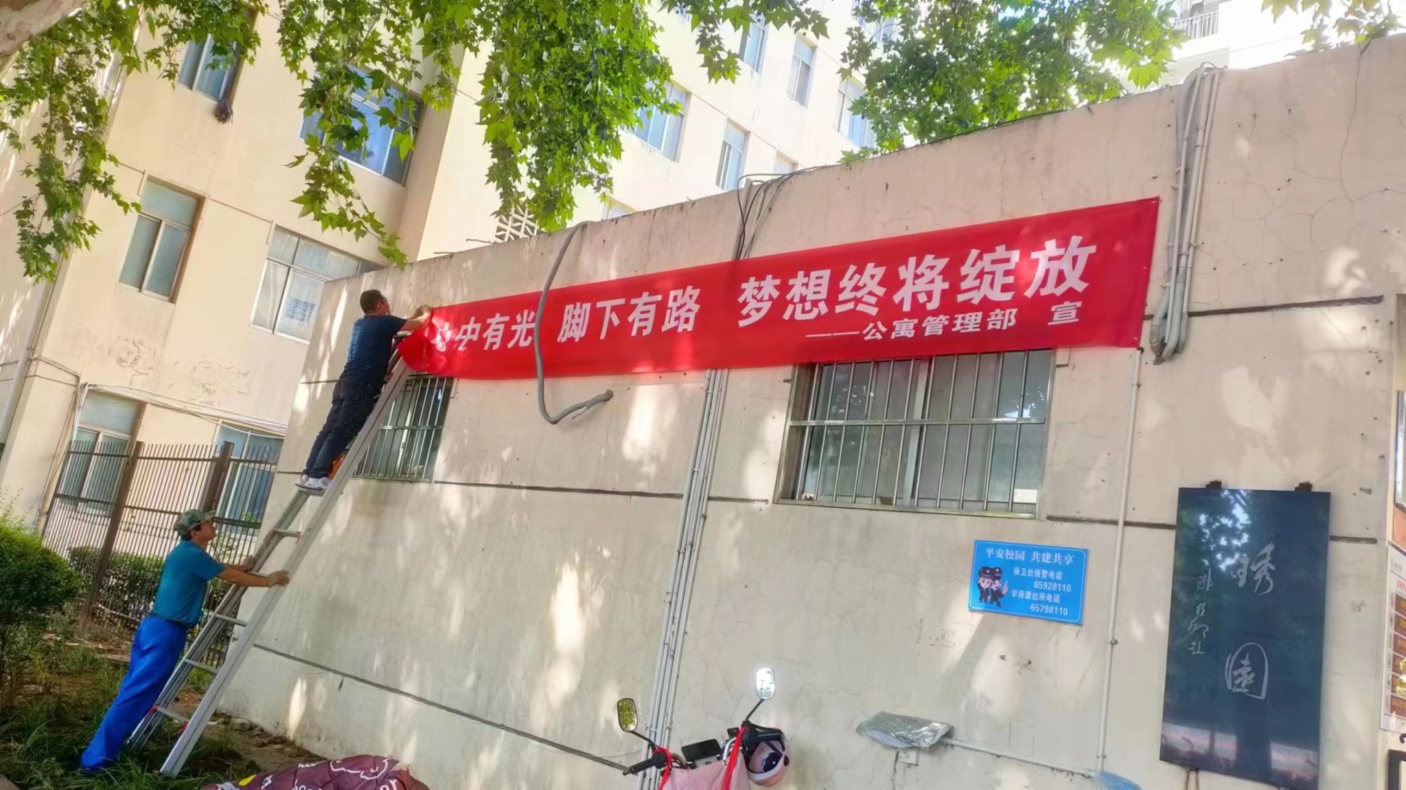 不但如此,在每一个公寓门前悬挂了温馨的宣传条幅和欢送毕业生的板报,字里行间,表达着宿管阿姨对学生们的爱。