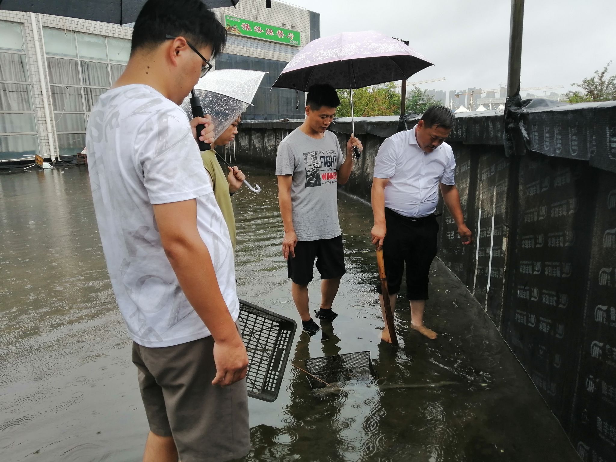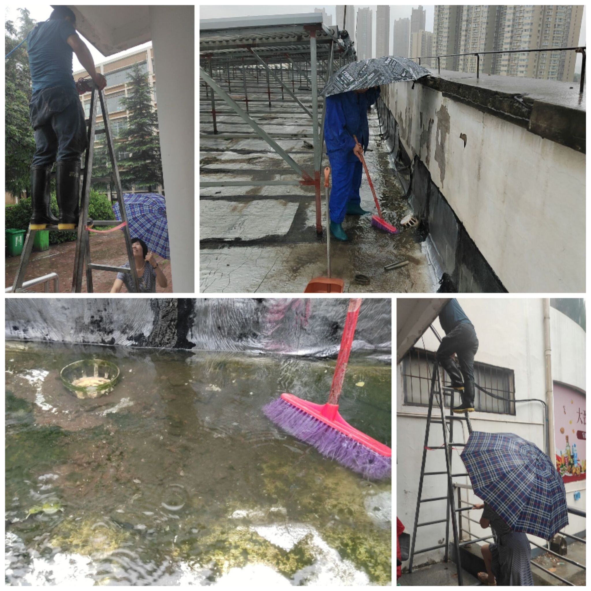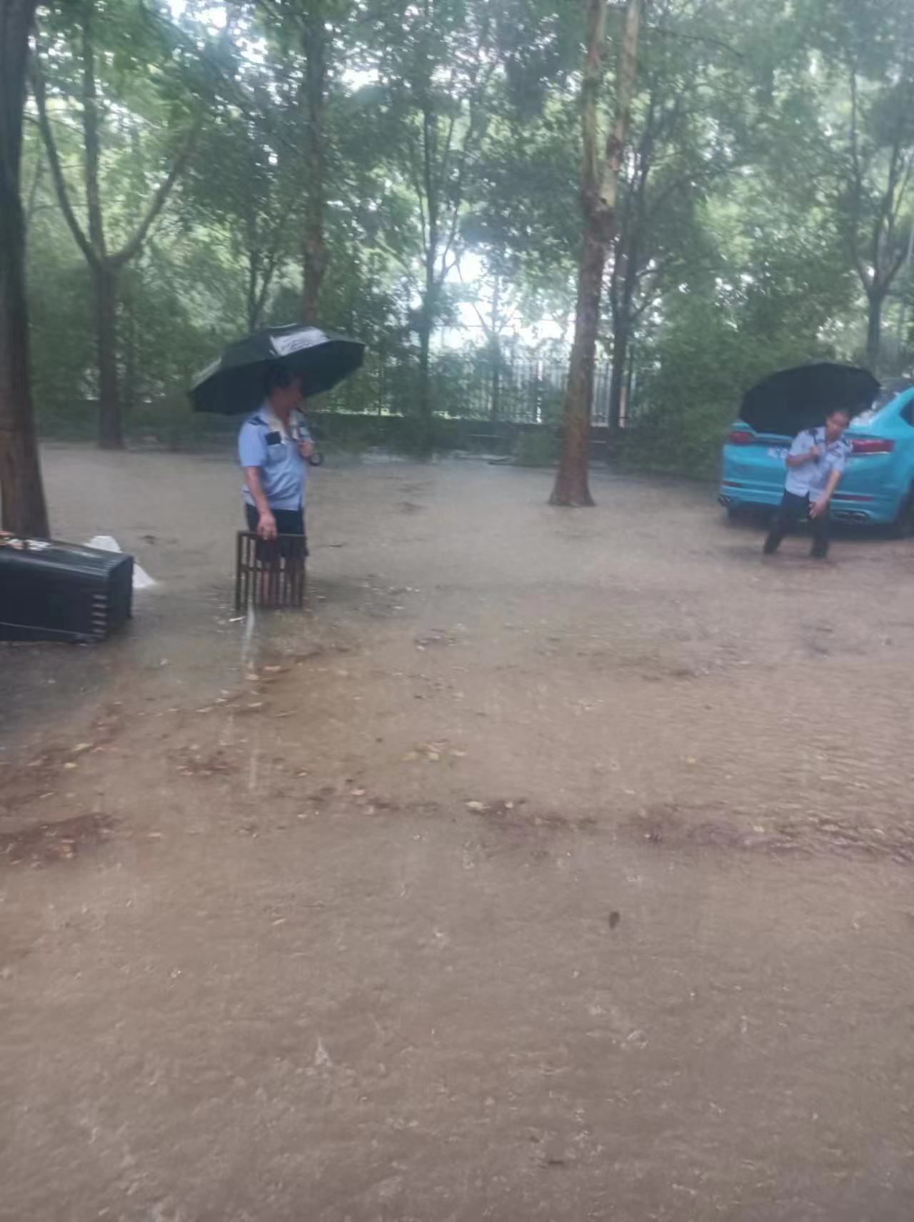 校园管理科在各校区实时排查,发现内涝区域或安全隐患及时上报;教室管理部组织人员冒雨检查各楼宇楼顶排水设施通畅;绿化保洁部在王城、开元两校区组织开展排水排涝,在深积水路段设置警示标牌,提醒师生绕行,保障校内师生人身安全;家属区物业及时在馨园、绿园家属区物业服务群发布天气预警,同时组织安保人员实施排水,针对安全隐患重点区域实施一人一片值守。
