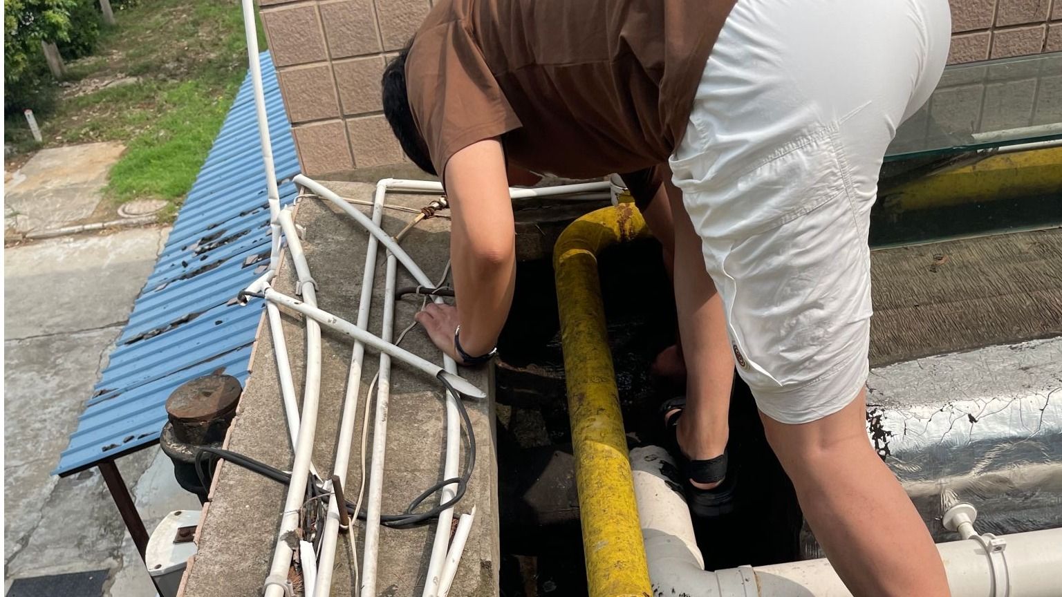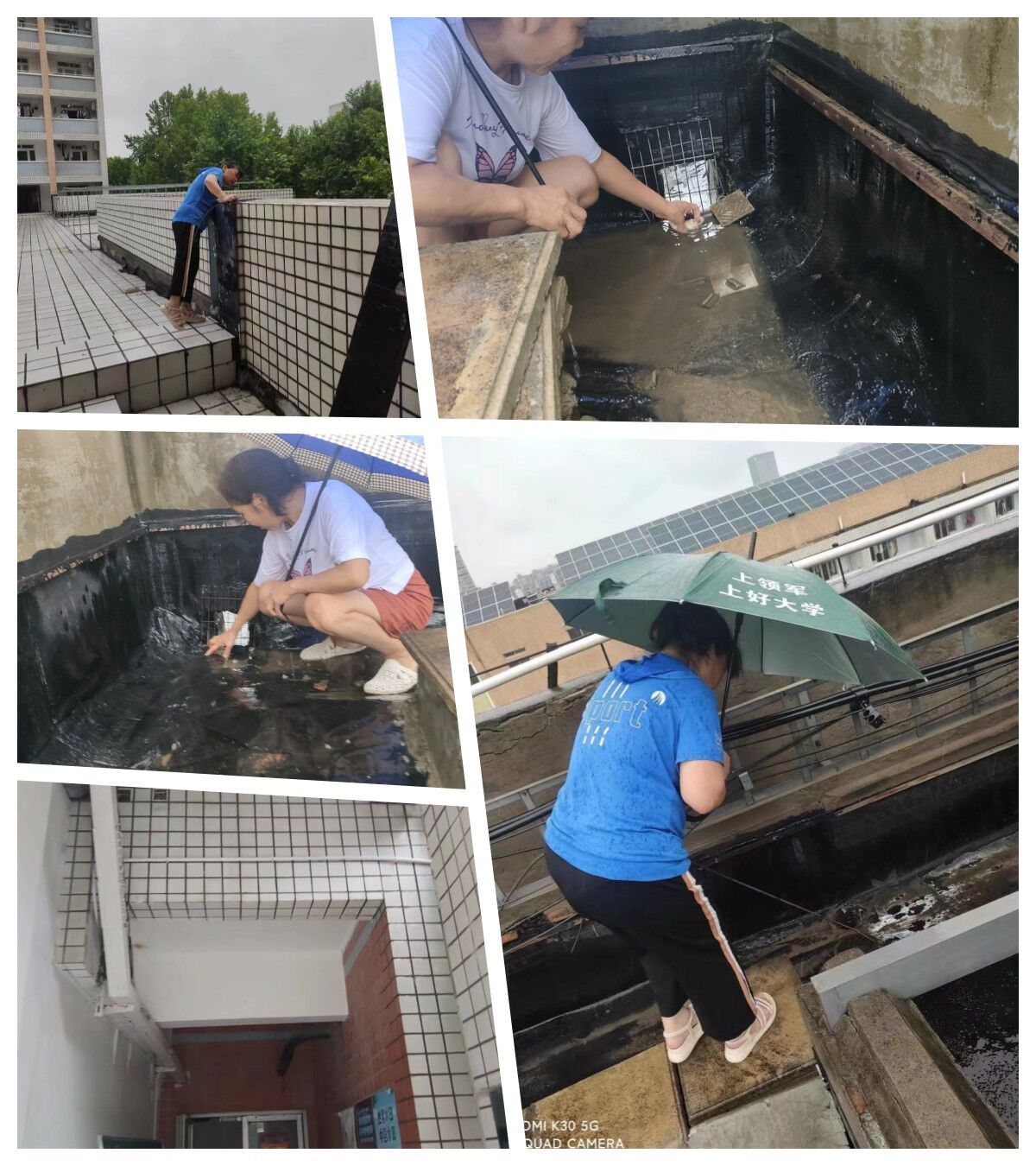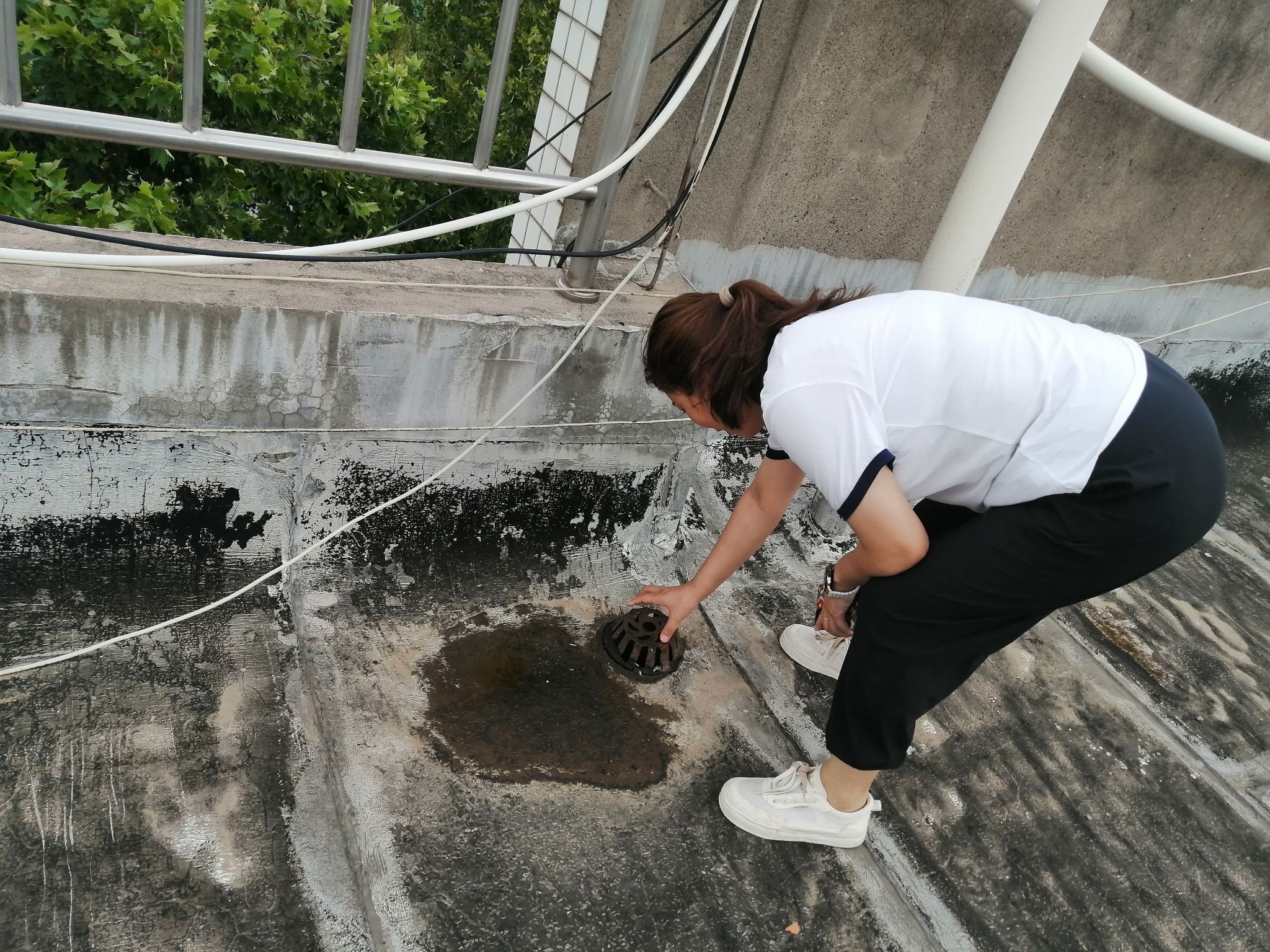 公寓部门员工,“地毯式”全面排查楼栋各排水口,组织人员清理楼顶排水沟和管道堵塞物等,最大程度降低台风对宿舍带来的影响。