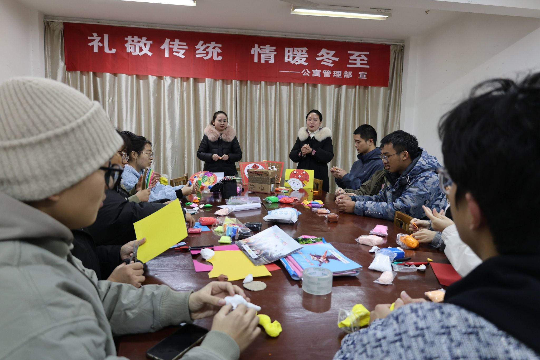 12月21日,在冬至来临之际,后勤管理处物业中心公寓部的宿管阿姨们和大学生在一起开展了以“礼敬传统 情暖冬至”为主题的庆冬至活动。