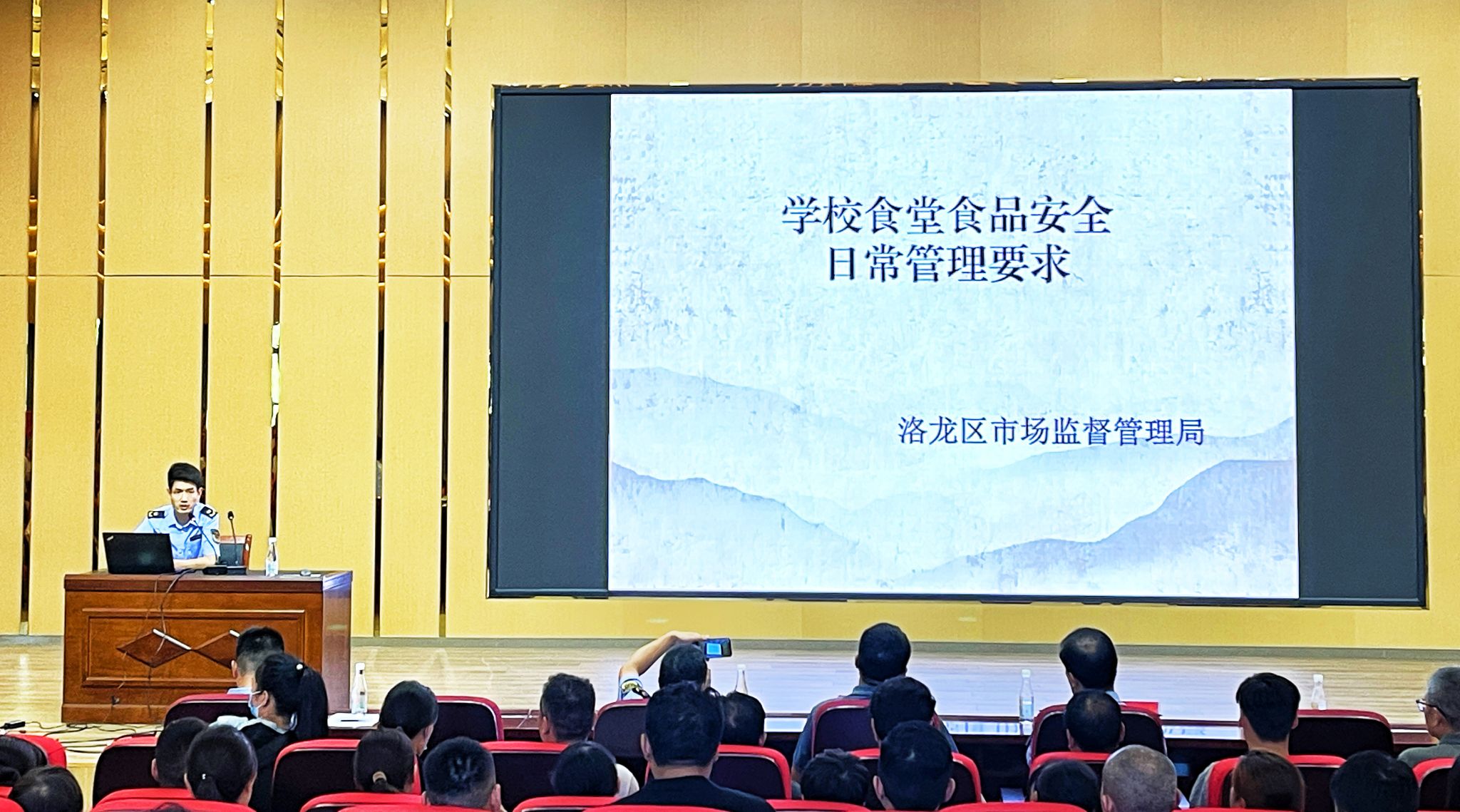 洛龙区市场监督管理局餐饮股赵晓涛股长作《餐饮服务操作规范》培训。从建筑场所与布局、设施设备、原料管理、供餐用餐、清洗消毒、废弃物管理、有害生物防制、食品安全管理、人员要求、文件记录等多个方面进行全面细致讲解,使参训人员进一步对食品安全知识和操作规范有了更深的认识,受益匪浅。