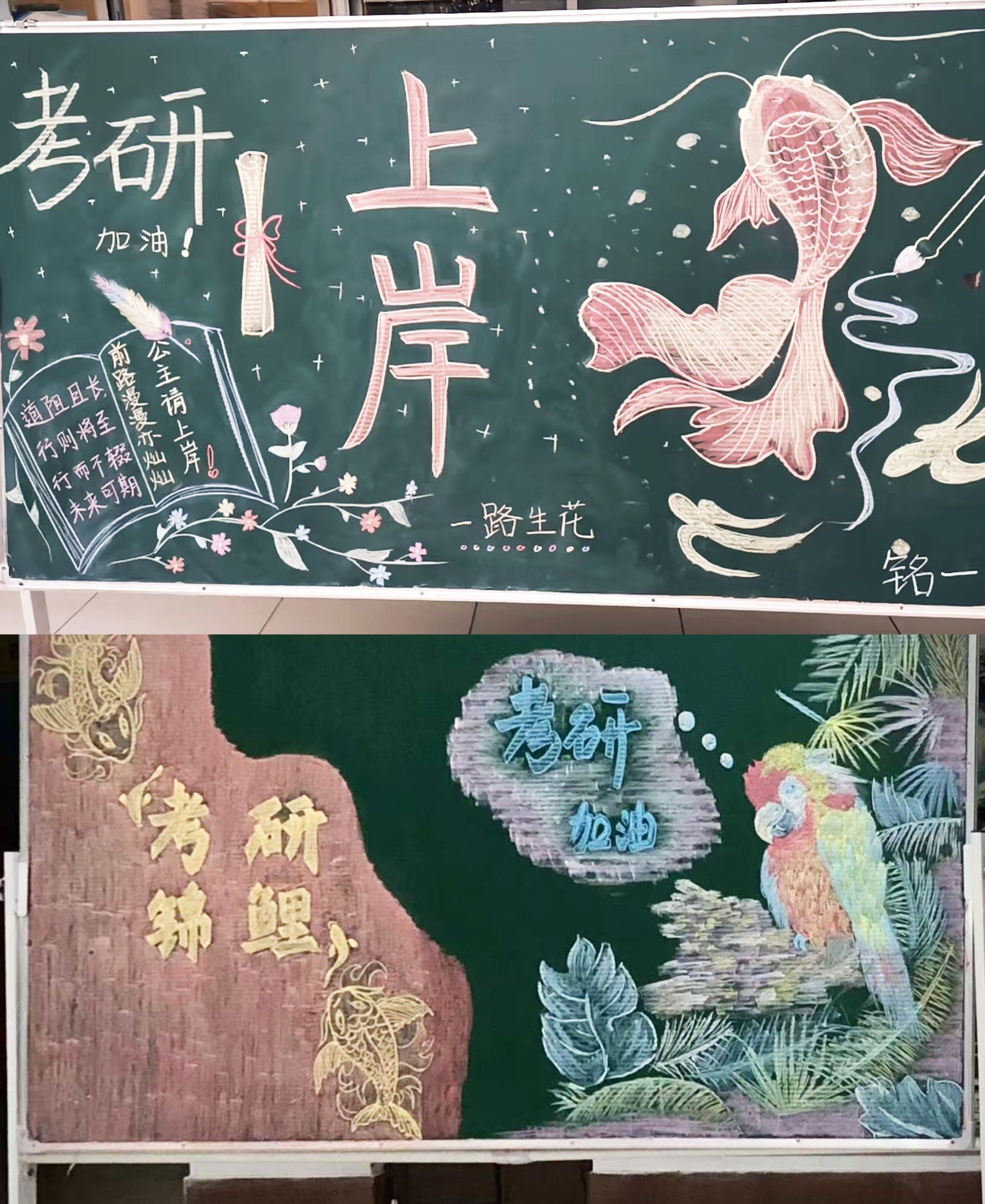 不但如此,公寓部员工还在各公寓门厅手绘多种多样的“考研加油”主题板报,用自己的方式为考试学生加油鼓劲。