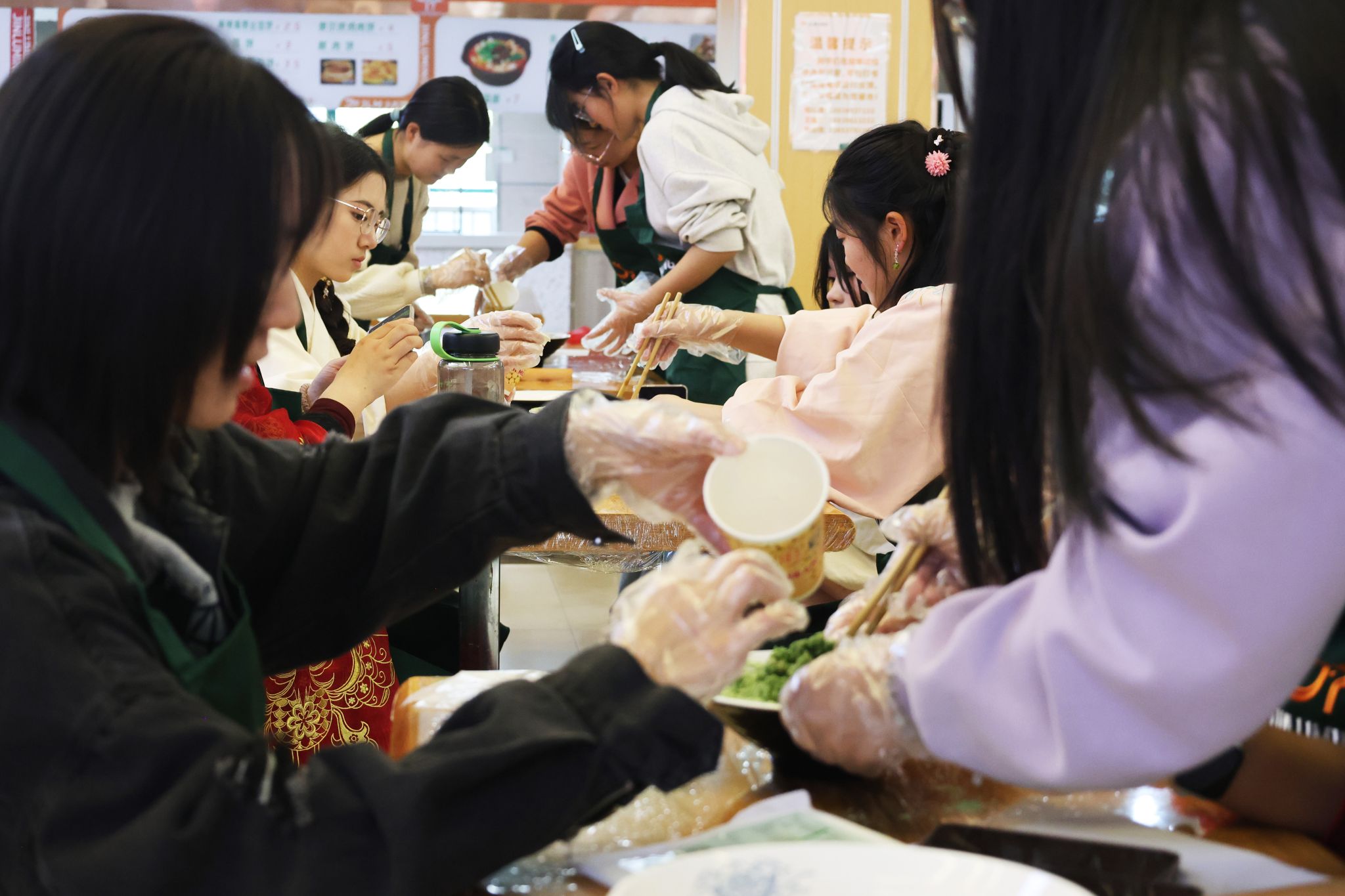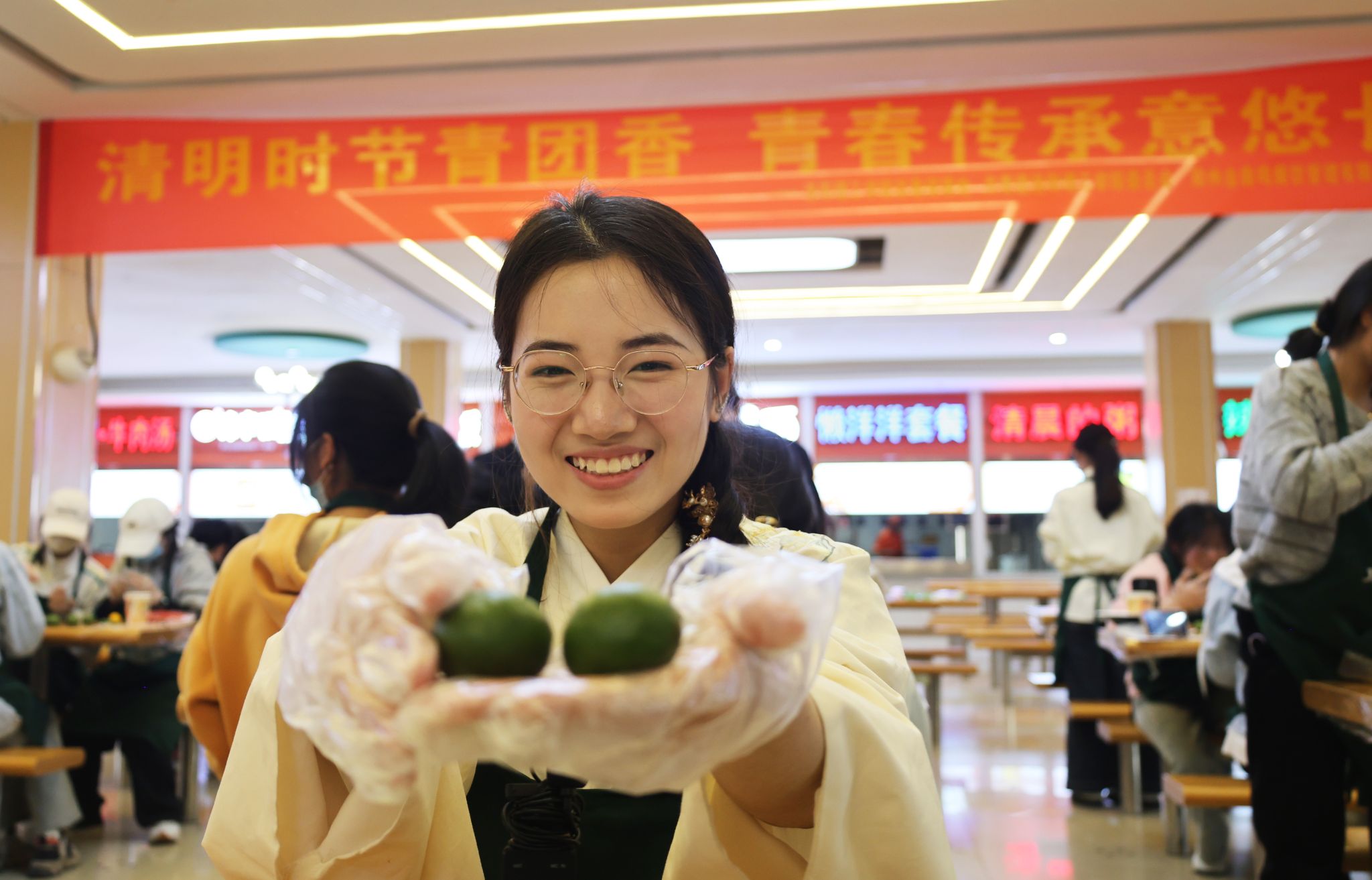 活动中,同学们纷纷动手尝试,分组协作,从和面、揉面剂、裹馅、塑形,逐步体验传统青团的制作工艺。高师傅穿梭其间,为大家指导要点和技巧,在一次次揉搓、包馅、捏合中,一个个浑圆可爱的青团逐渐成型,不仅象征着春天的勃勃生机,还包含着同学们对于美好生活的祝愿。
