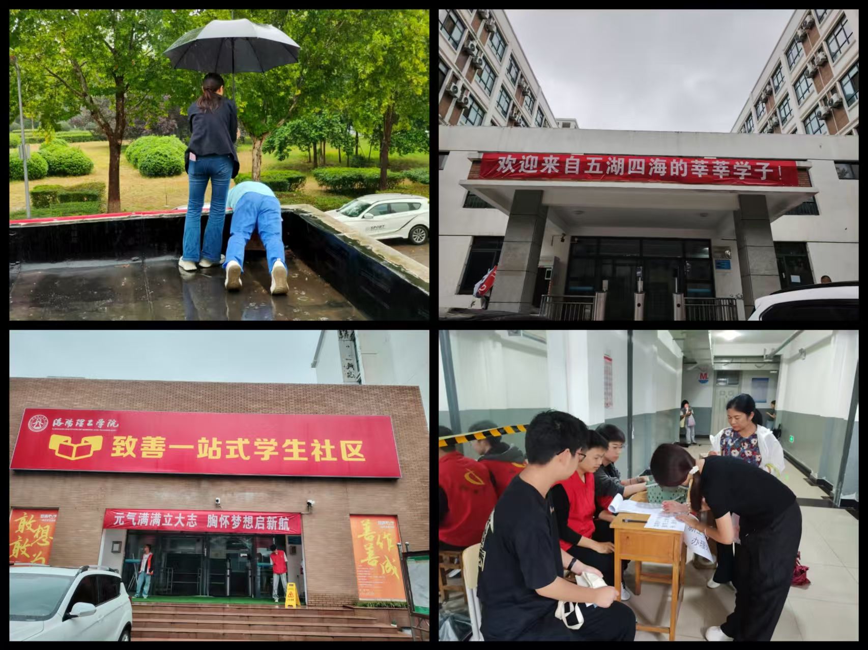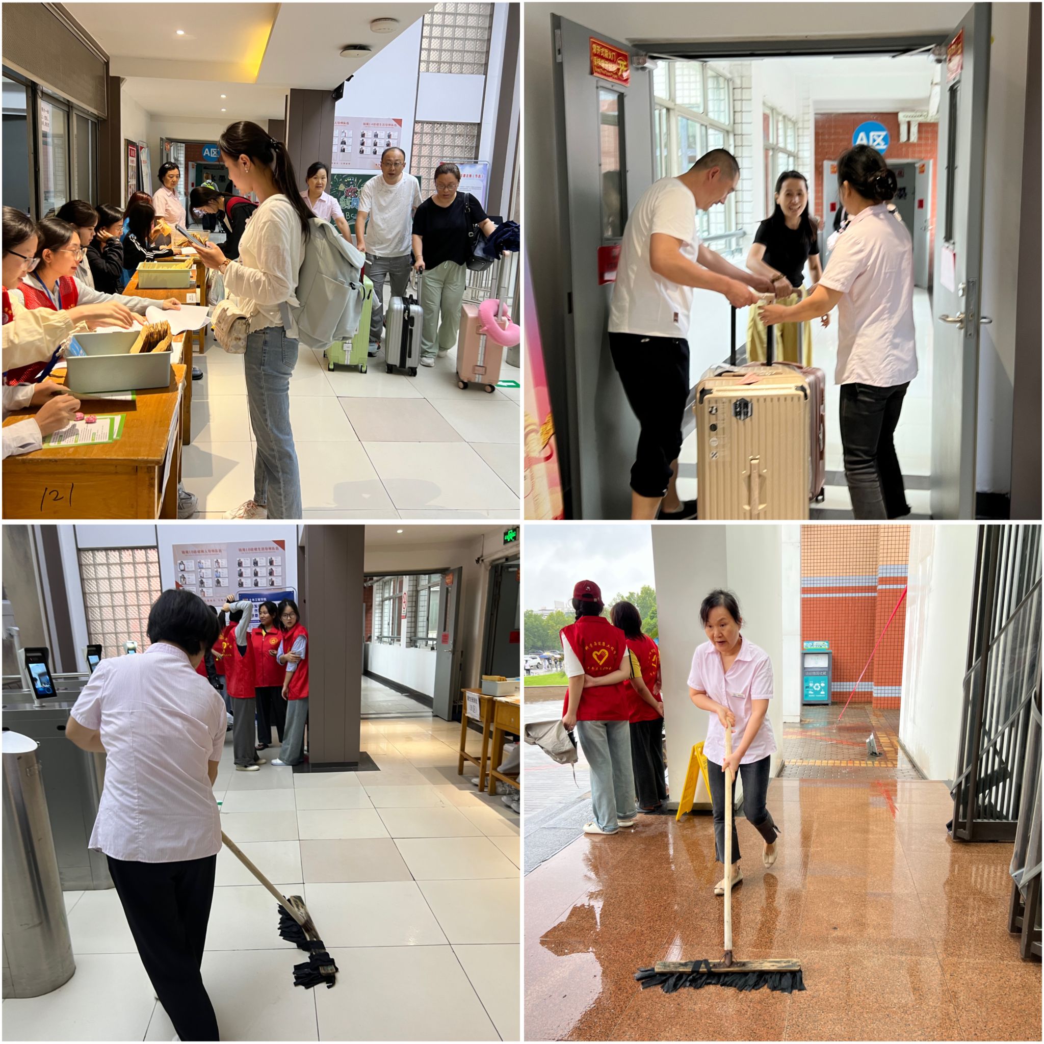 迎新现场,后勤人的身影随处可见:在门口疏导车辆,确保交通顺畅;在行李转运点帮忙搬运行李,汗水浸湿了衣衫;在咨询台耐心解答住宿、就餐疑问,一遍又一遍不厌其烦…… 下雨的时候,他们搭起帐篷、铺上防滑垫、打扫积水等等,这些看似平常的 “小事”,却是后勤人践行 “三服务 三育人” 理念的生动写照。