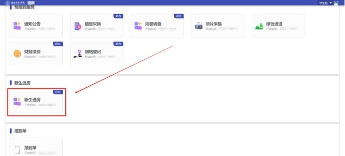 通过网址(//xsfw.sec.meigaomeient.com/xsfw/sys/yxapp/*default/index.do#/xsbd_new)登录系统后点击“新生选房”服务项,进入网上选房操作(以6人间宿舍为例,其他户型选房操作办法与此相同)。