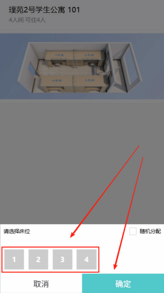 点击房间后出现如下图所示床位号选择框,勾选后点击确认则选房成功(注:只允许选择一次床位,谨慎确认):