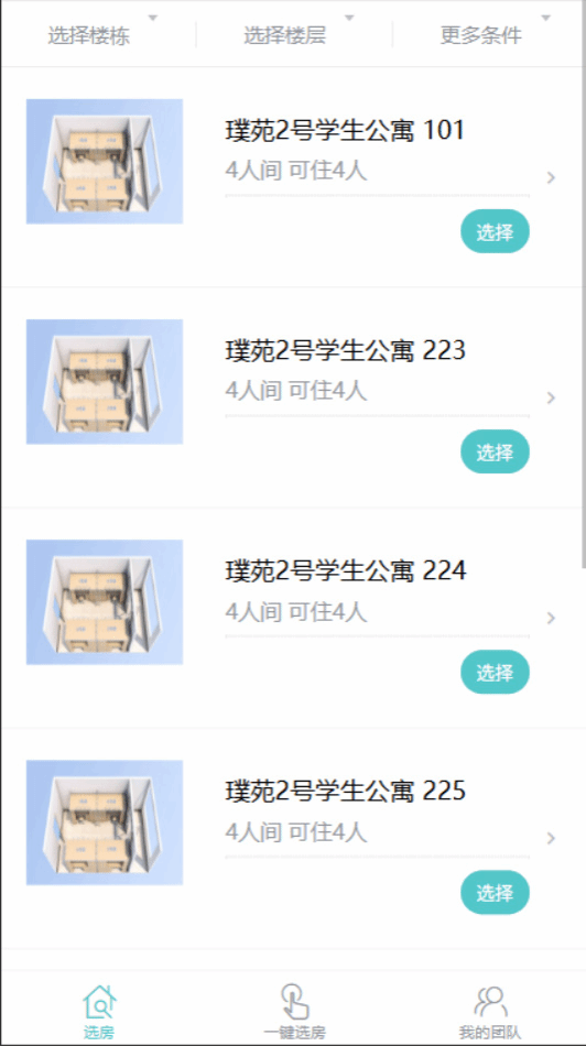 点击“我要选房”展示可选宿舍如下图,确认适合宿舍后点击“选择”进入宿舍详情页面。