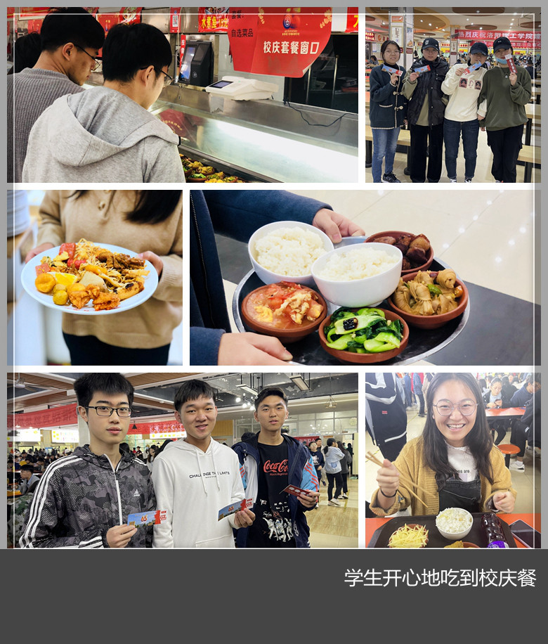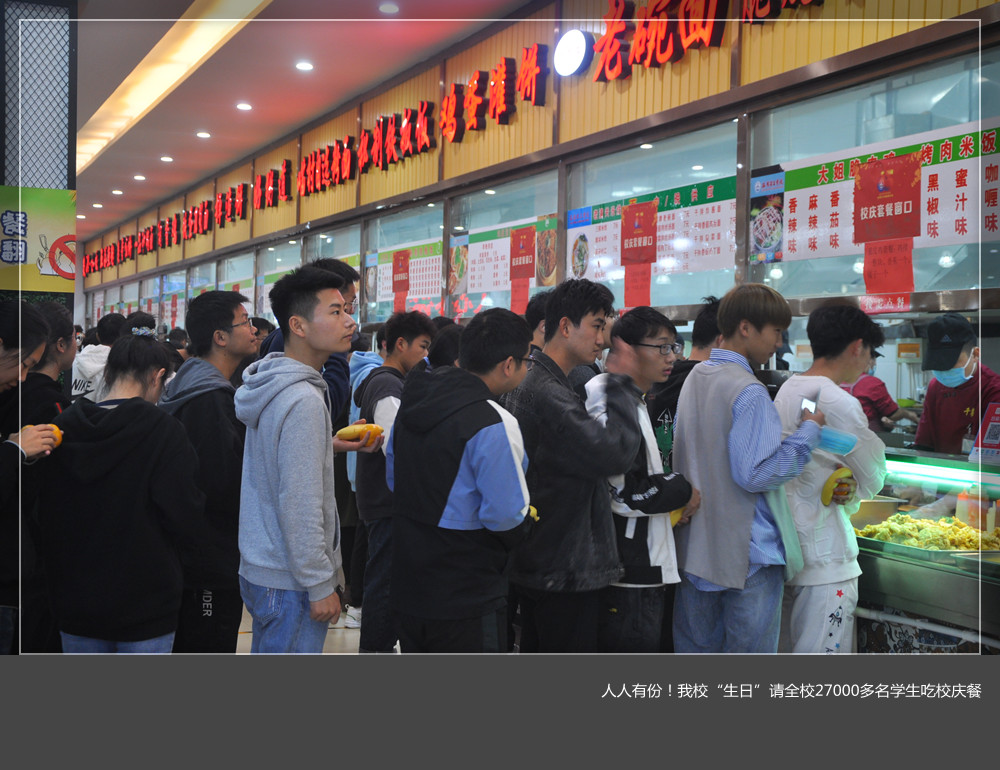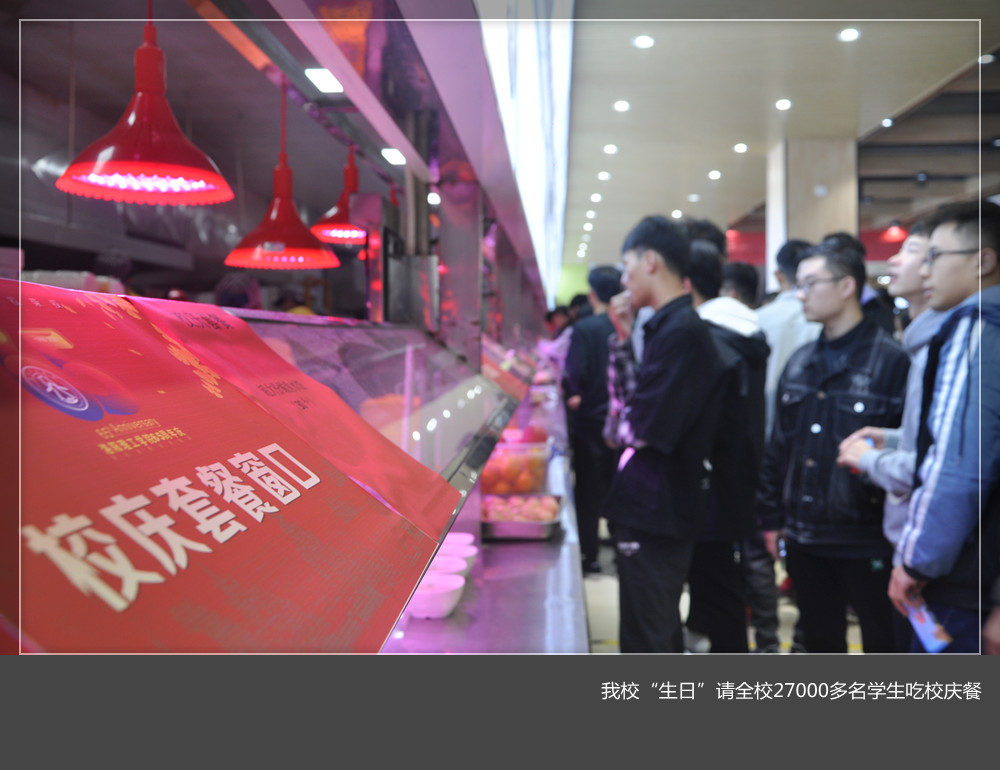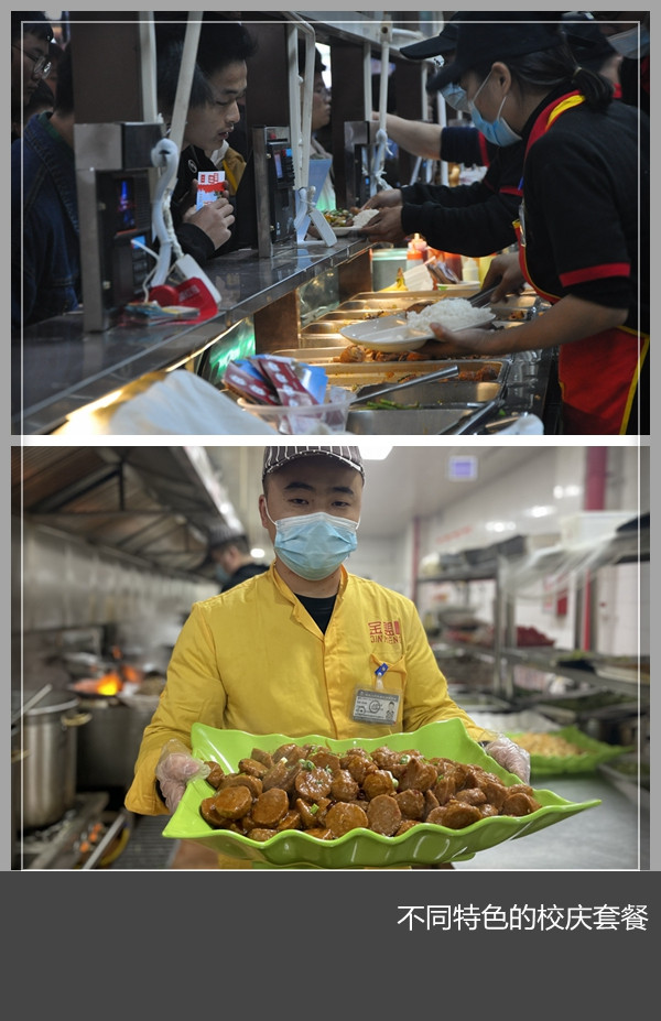 后勤管理处饮食服务中心负责人介绍,今天是我们美高梅娱乐场 建校65周年的校庆日,为与学生们共同庆祝,以“铭记校史,荣校爱校”为主题,美高梅娱乐场 三个校区6个餐厅为全校学生在这一天定制了不同特色的校庆套餐,全校27000多学生们人人有份。为了做好这一工作,美高梅娱乐场 学工部、后勤管理处、校团委等相关部门沟通合作,精心安排,印制餐券,合理分配,确保就餐秩序井然、卫生安全,供应足量,受到了学生们的一致好评。餐厅后厨师傅们也比平时起得早,忙碌着为学生们备餐,称能在美高梅娱乐场 校庆的日子为学生们服务很高兴。