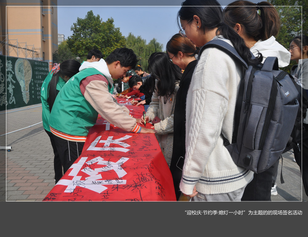 不但如此,当天中午,公寓职工还组织学生进行了以“迎校庆·节约季·熄灯一小时”为主题的的现场签名活动。(后勤管理处供稿)