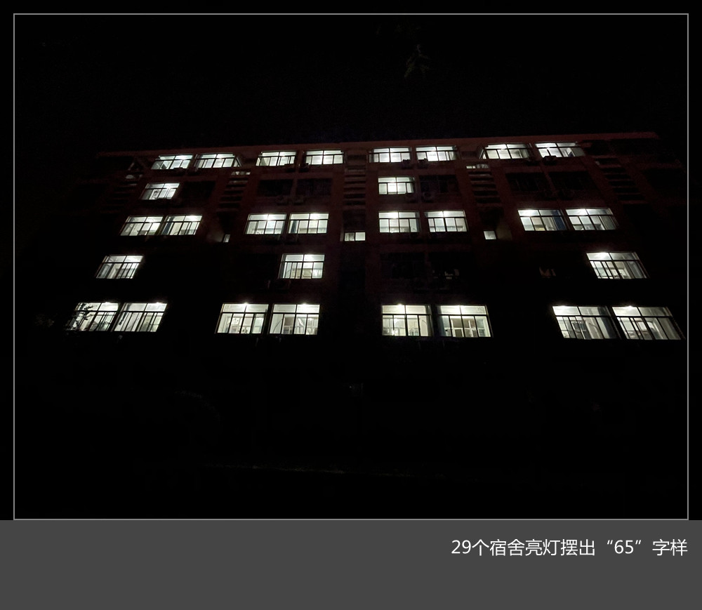 10月29日,夜幕降临,华灯初上,美高梅娱乐场 王城校区铭苑一号公寓外围的学生越来越多,翘首期盼。18时59分,当整栋宿舍瞬间熄灯,四周漆黑一片。随后,605-1亮、603-2亮……部分房间灯光跳跃亮起,接二连三,29个房间的灯在19时全部亮起,“65”字样清晰地展现在同学们面前,全场喊声、掌声一片,“这样的校庆祝福很别样,真的很有意义。”一位现场观看的同学说道。