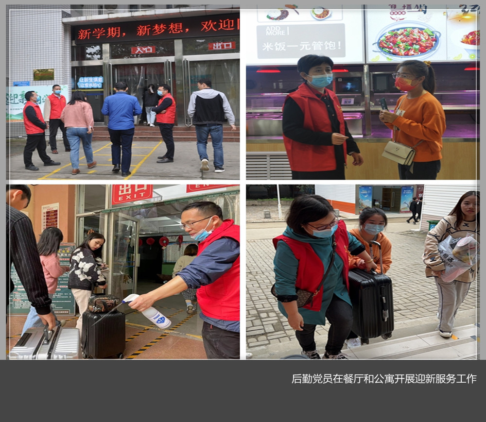 在公寓,党员们在学生入口处,有的在为学生测量体温,有的在为学生行李消杀,有的在为学生搬运物品,忙的不亦乐乎,党员李斌同志已经为新生搬运物品上下楼了5趟,额头上都冒出了硕大的汗珠,他笑着说:“为学生们服务,心里很高兴,冒点汗,值得……”
