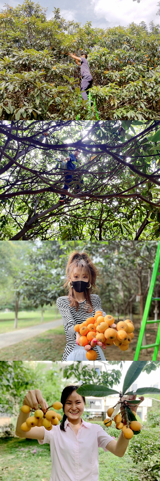 在开元校区九九广场采摘点,为了采摘到树尖上最大最甜的果实,职工们有的踩着梯子,有的攀爬到树上,不断把高处黄橙橙的枇杷果传送下来;在浴池采摘点,职工们一边摘果子一边装袋子,分装有序;琇苑公寓采摘点虽然女职工们较多,但巾帼不让须眉,在自制采摘神器的加持下,一会功夫就收获了满满一箩筐;王城校区馨园采摘点,职工们手持竹竿,从敲果到撑布接果,配合默契、效率满满。