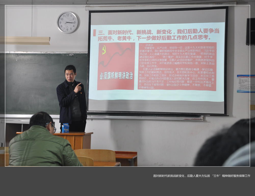 11月23日下午,后勤党总支书记丁国强以《大力弘扬“三牛”精神,强化责任勇于担当,全力提高后勤服务保障水平》为题的进行了专题授课,后勤党政班子成员、科级干部及业务骨干40余人参加了学习。