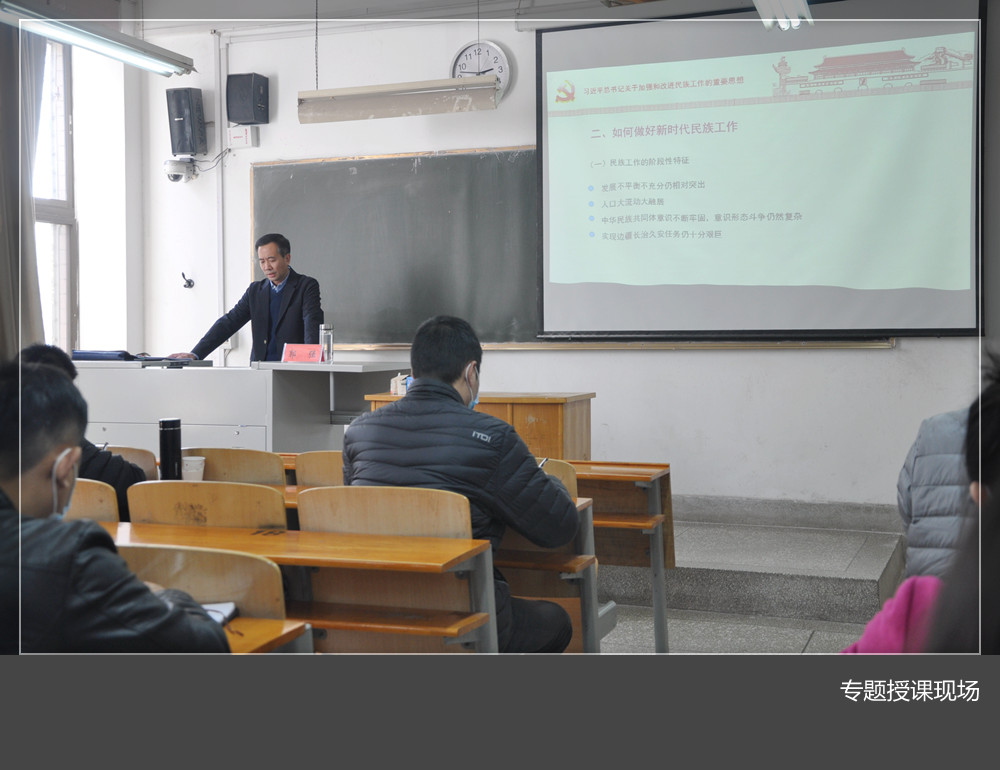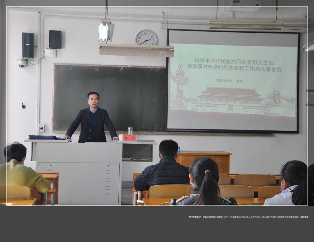 课堂上,郭部长从习近平总书记关于加强和改进民族工作的重要思想、如何贯彻落实好新时代民族工作以及国家宗教政策法规、我国宗教工作的基本方针等方面进行了精彩授课,并通过列举身边的诸多事例,深入浅出地介绍了做好民族宗教工作的思维和方法,他还重点强调了:杜绝和禁止任何人以任何名义在校园内传播宗教和开展宗教活动,让大家牢记“两个不得”、“五个严禁”。