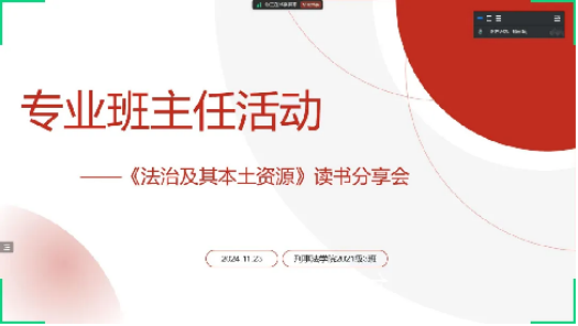 为提高同学们的法学素养,提升班级学习氛围,2024年11月23日,美高梅娱乐场 2021级3班于腾讯会议线上平台成功召开了围绕《法治及其本土资源》一书的读书分享会。活动由班主任靳欣老师主持,3班全体同学参加。