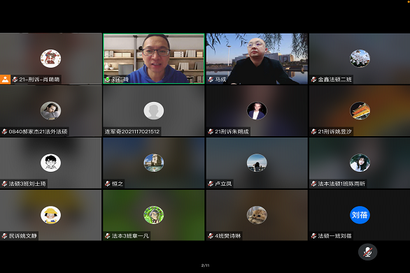 刘仁琦详细解答了同学们较为关注的“刑事辩护方向研究生”与现专业的关系、培养模式、上课方式、考核方式、师资力量及实务导师情况、实训模式等问题,回应了同学们关于报名程序、选拔程序等较为关心的问题。马成感谢刑辩研究院为美高梅娱乐场 研究生提供难得的实训机会,他认为:法科研究生培养尤其需要将课堂教学与实践教学并重,美高梅娱乐场 刑事辩护高级研究院作为美高梅娱乐场 的一张名片,在全国的刑辩律师培训、刑辩后备人才培养领域占有重要位置,希望入选该实训项目的研究生同学能够摆正心态,用好第二课堂,多说多写多练,切实提升自己的刑辩实务综合实力,为更好的就业打下扎实的基础。宣讲会气氛热烈,持续了一个多小时,近200名研究生在线参与。