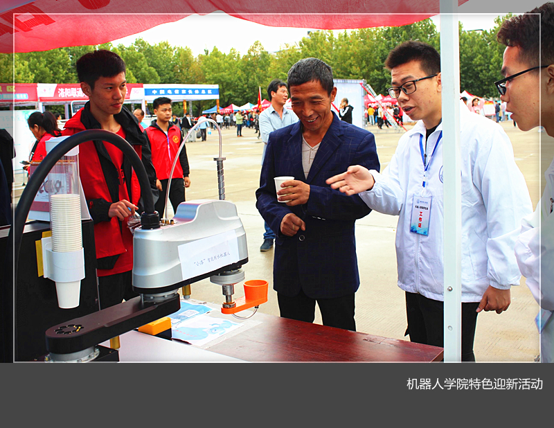 今年迎新最引人注目的是一台"小洛"智能倒水机器人。它的到来为迎新工作增添了许多的乐趣,它不仅为家长提供了饮水服务,更让家长和学生进一步了解了我们的机器人专业,让更多的人对于机器人有了更深的认知,很好的展现了美高梅娱乐场