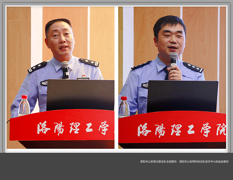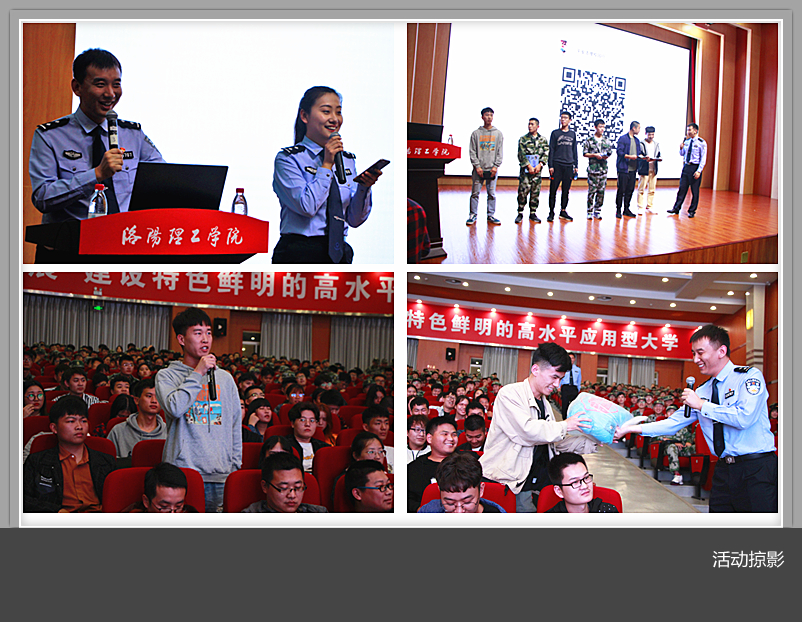 宣讲会上,洛阳市公安局交警支队王剑警官通过发生在学生身边的案例和直观的监控视频,讲述了交通事故的严重后果和危害。警示同学们时刻注意交通安全,严格遵守交通法规,坚决摒弃交通陋习,抵制不文明交通行为,确保自己和他人生命财产安全;洛阳市公安局刑侦支队反诈中心赵金金警官结合目前高校频发的电信网络诈骗案件,详细介绍了电信网络诈骗猖獗的原因,并结合真实案例向同学们分析了电信网络诈骗的套路,针对其特点向同学们传授辨别方法和防范措施。
