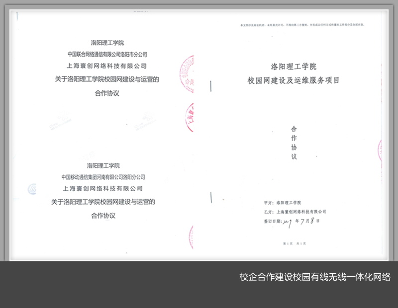 与上海寰创网络科技有限公司、洛阳移动公司、洛阳联通公司和洛阳电信公司达成了建设校园有线无线一体化网络的合作协议,经过暑期以来四个多月的紧张施工建设,9月1日校园无线网络投入试运行,并不断优化校园网络,于11月1日校园无线有线一体化网络正式投入使用,实现了美高梅娱乐场
