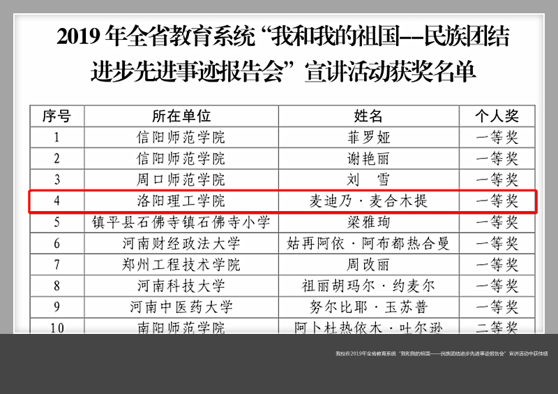 选报的由麦迪乃·麦合木提同学参与宣讲的《我在中原上大学》荣获一等奖。