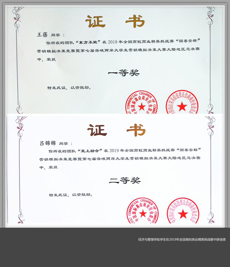 市场营销专业两支代表队在2019年全国高校商业精英挑战赛营销模拟决策竞赛暨第七届海峡两岸大学生营销模拟决策大赛大陆地区总决赛中,分别获得一等奖和二等奖。