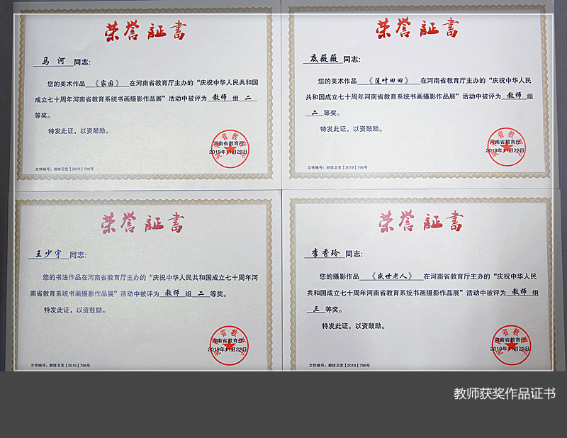 在教师组作品评选中,马河老师的美术作品《家园》、底薇薇老师的美术作品《莲叶田田》、王少宇老师的书法作品获二等奖,李香玲老师的摄影作品《盛世老人》、郭朝卿、王宏民、邢立志老师的书法作品获三等奖。