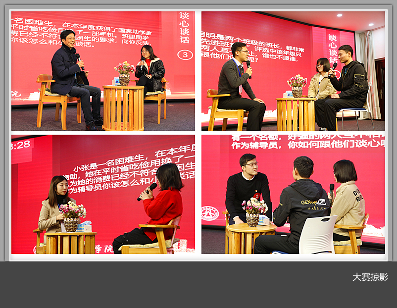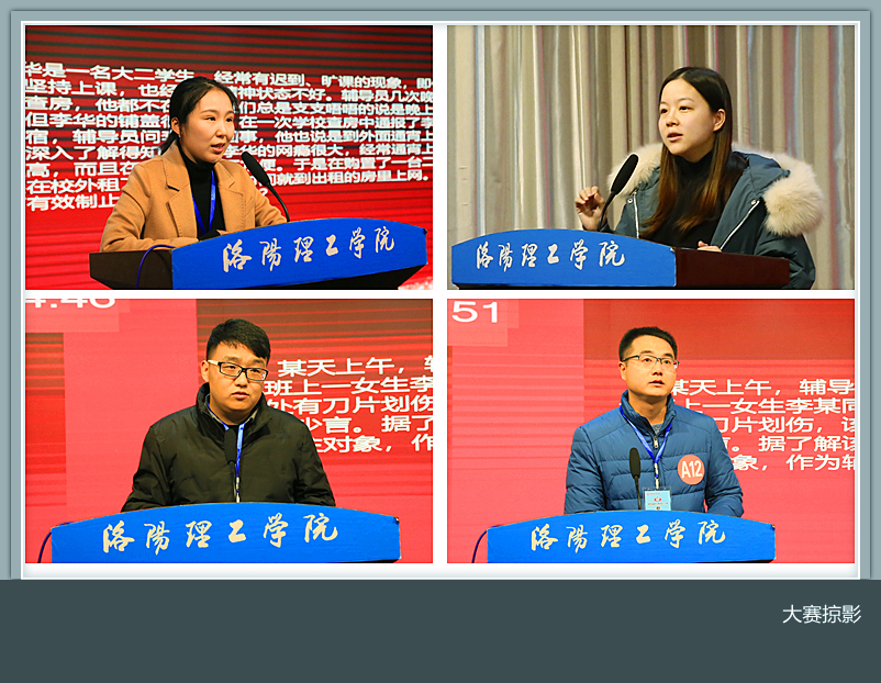 本次大赛参照全国辅导员素质能力大赛的标准,分笔试、案例分类、谈心谈话、理论宣讲四个环节进行。大赛共有89名辅导员参与笔试,笔试主要考察辅导员对于习近平新时代中国特色社会主义思想及相关理论知识的掌握程度、网文写作能力。经过笔试, 25名选手成功晋级。在案例分析环节,选手根据日常工作经验,结合思想政治教育的要求,对典型案例进行剖析,并提出应对措施和解决方案,突出展示了辅导员分析问题、解决问题能力,15名辅导员进入谈心谈话环节。谈心谈话环节,以情景再现的方式,选手就学生学习、生活、心理、入党、就业等一系列相关问题开展了谈心谈话,展现出辅导员良好的教育引导学生的能力和对问题特点及学生成长成才规律的把握了解,10名辅导员进入理论宣讲环节。在理论宣讲环节,参赛选手围绕习近平总书记在建国70周年的讲话、在河南考察调研时讲话精神、打铁还需自身硬等内容等用青年学生听得懂、听得进的话语,或真切感人、或激昂振奋地讲述中国故事,进行理论分析,让理论知识鲜活起来,体现了良好的理论宣传阐释能力。