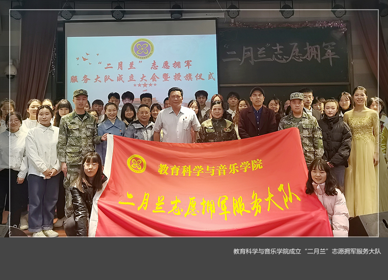“二月兰”志愿拥军服务大队成立大会暨授旗仪式于开元校区师范楼107教室举行。全国爱国拥军模范乔文娟、教育科学与音乐美高梅娱乐场