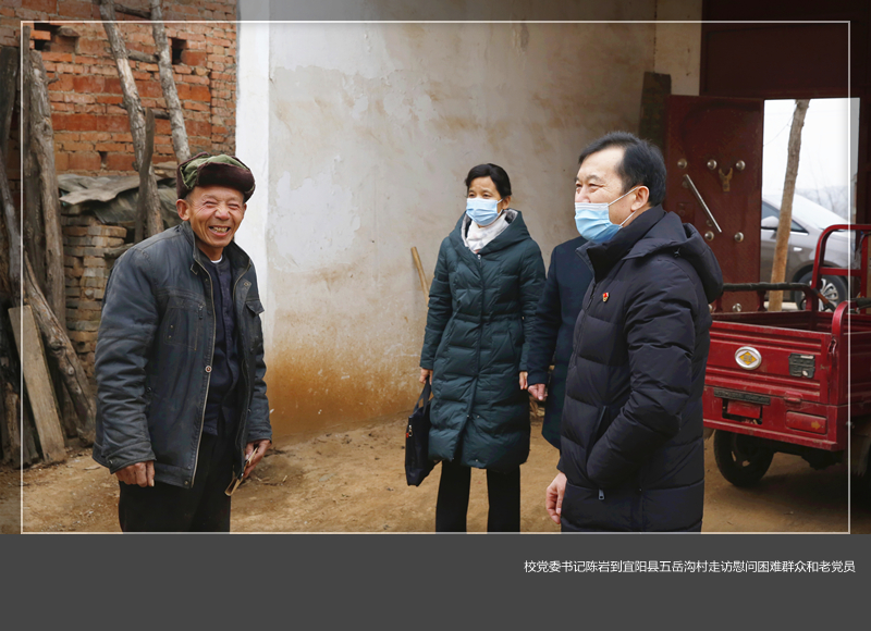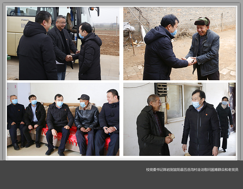 1月27日上午,校党委书记陈岩带领美高梅娱乐场 二级党组织、机关部门代表一行70余人赴美高梅娱乐场 定点扶贫村——宜阳县韩城镇五岳沟村看望慰问驻村第一书记、困难群众和老党员,向他们送上节日的祝福和组织的关怀。