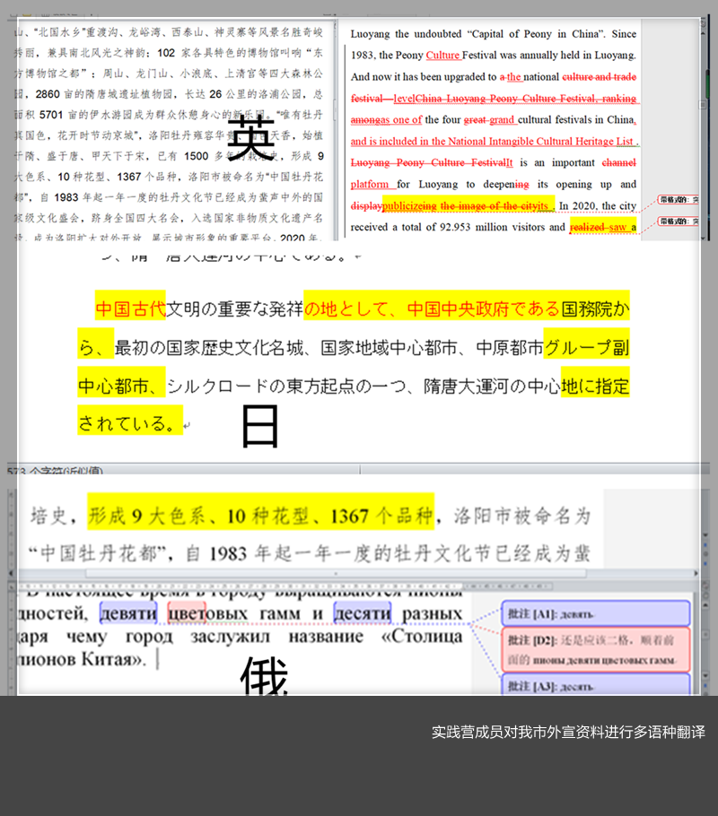 本次暑期实践活动主要是协助中共洛阳市委外事工作委员会办公室解决外宣材料老旧滞后的问题,对我市外宣资料进行中、英、日、俄多语种的整理、更新、修正和翻译等,最终形成多语种版洛阳市外宣手册,供市委外事办作为外宣资料、外事活动伴手礼等在外事活动中使用。