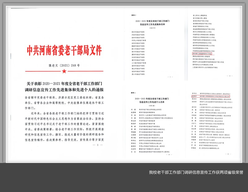 近日,中共河南省委老干部局印发《关于表彰2021年度全省老干部工作部门调研信息宣传工作先进集体和个人的通报》(豫老文[2021]248号),美高梅娱乐场 离退休工作处被评为“2021年度全省老干部工作部门信息宣传工作先进集体”、离退休工作处刘艳芳同志被评为“2021年度全省老干部工作部门信息宣传工作先进个人”。