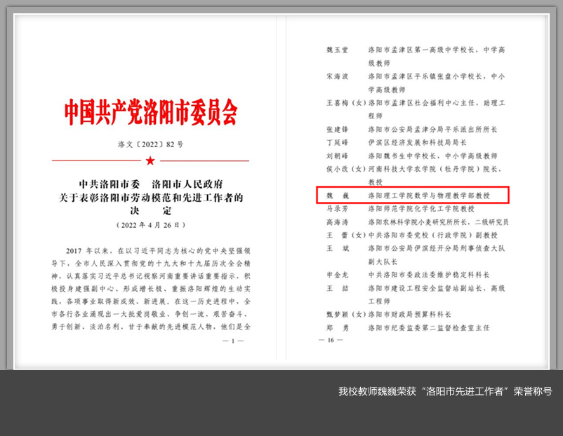 数学与物理教学部魏巍教授荣获“洛阳市先进工作者”荣誉称号并受到表彰。