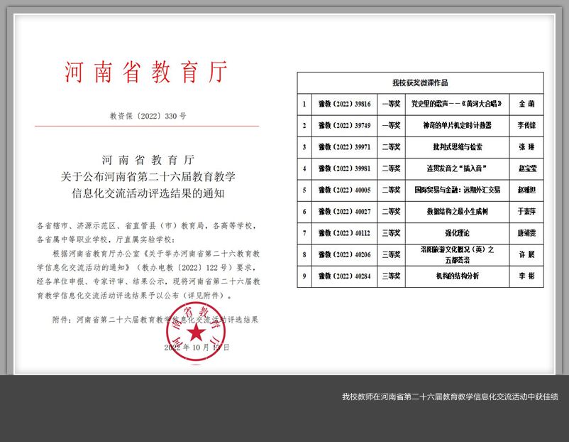 近日,河南省教育厅印发了《关于公布河南省第二十六届教育教学信息化交流活动评选结果的通知》(教资保【2022】330号)文件,美高梅娱乐场