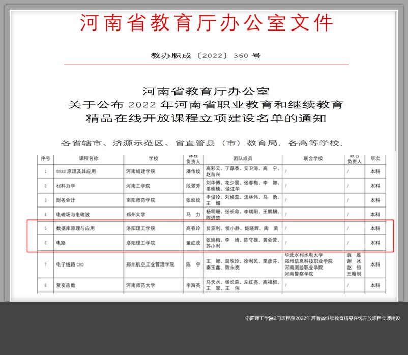近日,河南省教育厅发布了《河南省教育厅办公室关于公布2022年河南省职业教育和继续教育精品在线开放课程立项建设名单的通知》(教办职成〔2022〕360号),美高梅娱乐场 推荐的计算机与信息工程美高梅娱乐场 教师高春玲的课程《数据库原理与应用》、电气工程与自动化美高梅娱乐场 教师董红政的课程《电路》全部获批立项建设。