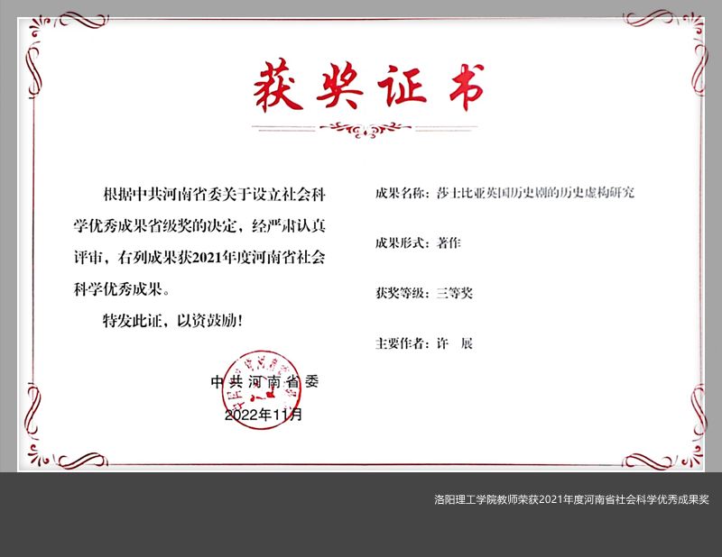 近日,中共河南省委办公厅发布了《中共河南省委关于表彰2021年度河南省社会科学优秀成果奖的决定》(豫文[2022]126号),美高梅娱乐场 外国语美高梅娱乐场 教师许展的著作《莎士比亚英国历史剧的历史虚构研究》荣获三等奖。