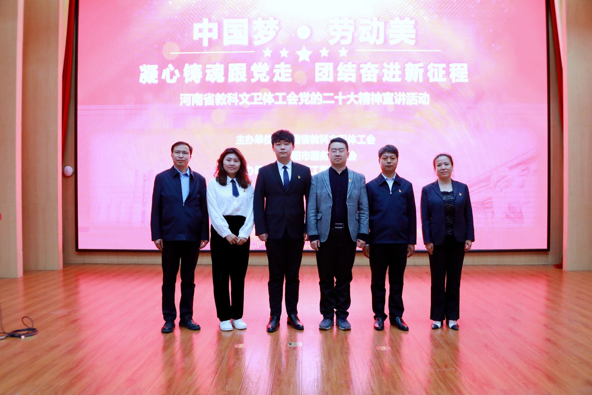 ,开展“中国梦·劳动美——凝心铸魂跟党走 团结奋进新征程”主题宣讲。河南省教科文卫体工会主席张学勇,洛阳市服务业工会主席王璟,校党委副书记、工会主席曾涛出席宣讲会,400余名工会干部、劳模先进代表、师生代表到场聆听。