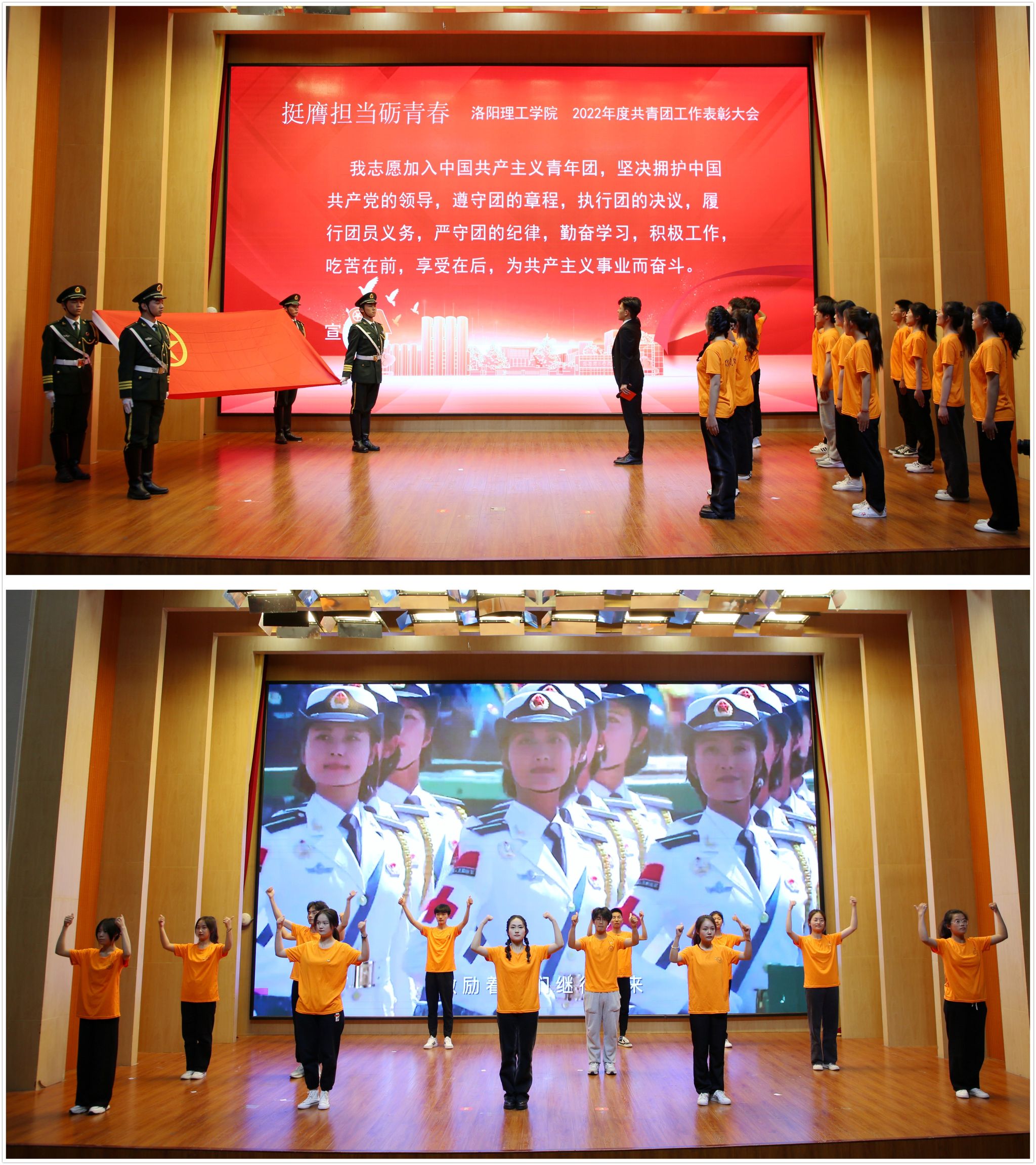 四名同学演唱的歌曲《强国一代有我在》,唱响了洛理工青年学子的家国情怀与责任担当。会上,青年团员代表面向团旗,重温入团誓词,伴随着《五月的花海》手势舞表演,大会落下帷幕。