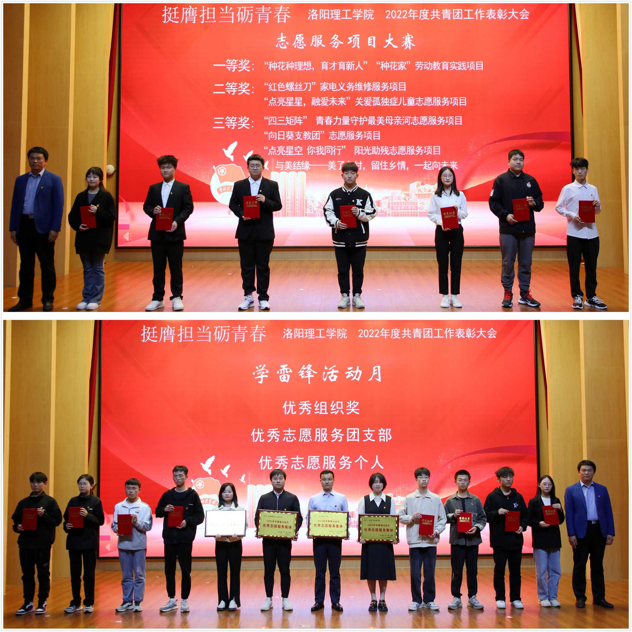 2022年科技创新重要赛事(中国国际“互联网+”大学生创新创业大赛、“挑战杯”大学生课外学术科技作品竞赛、“挑战杯”中国大学生创业计划竞赛)校赛获奖集体颁奖;为2022年志愿服务项目大赛、雷锋活动月等志愿服务活动获奖集体和个人颁奖;对一年来全校共青团工作中涌现的先进集体、优秀个人进行了表彰。大会共表彰“优秀团员”1003名、“模范团干部”354名、“五四红旗团支部”75个。经济与管理美高梅娱乐场