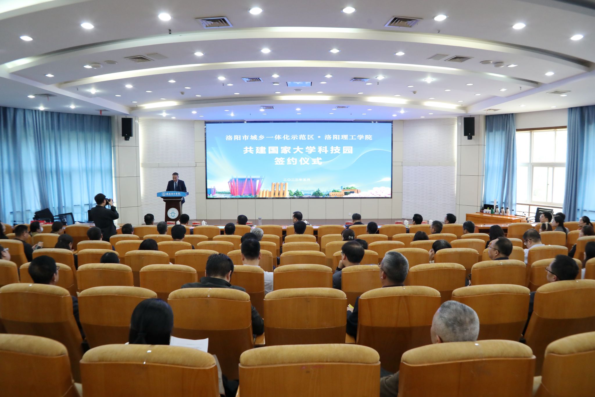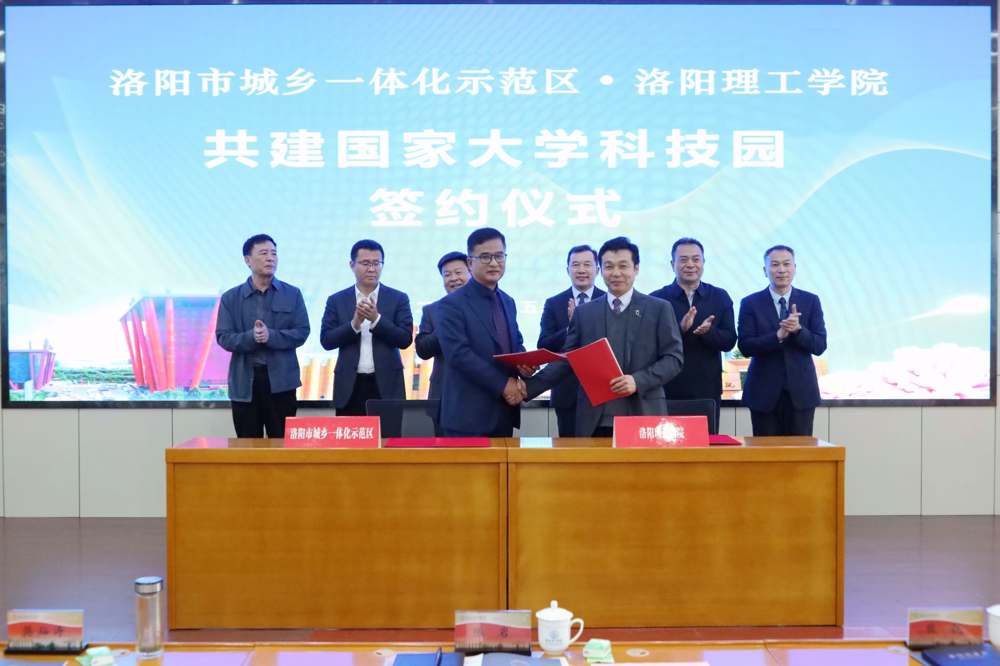 共建国家大学科技园签约仪式在王城校区办公楼二楼报告厅举行。洛阳市城乡一体化示范区党工委副书记、管委会主任樊灿涛,示范区党委委员、常务副主任张宛澍,示范区科技城管委会副主任冯志昌,示范区政协工委副主任赵杰瑞及美高梅娱乐场