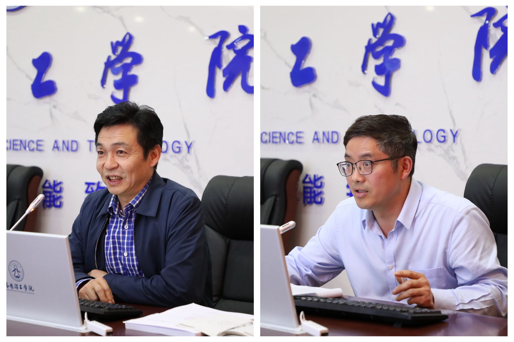 副校长黄志全教授(左)、王新武教授(右)作现场验收汇报