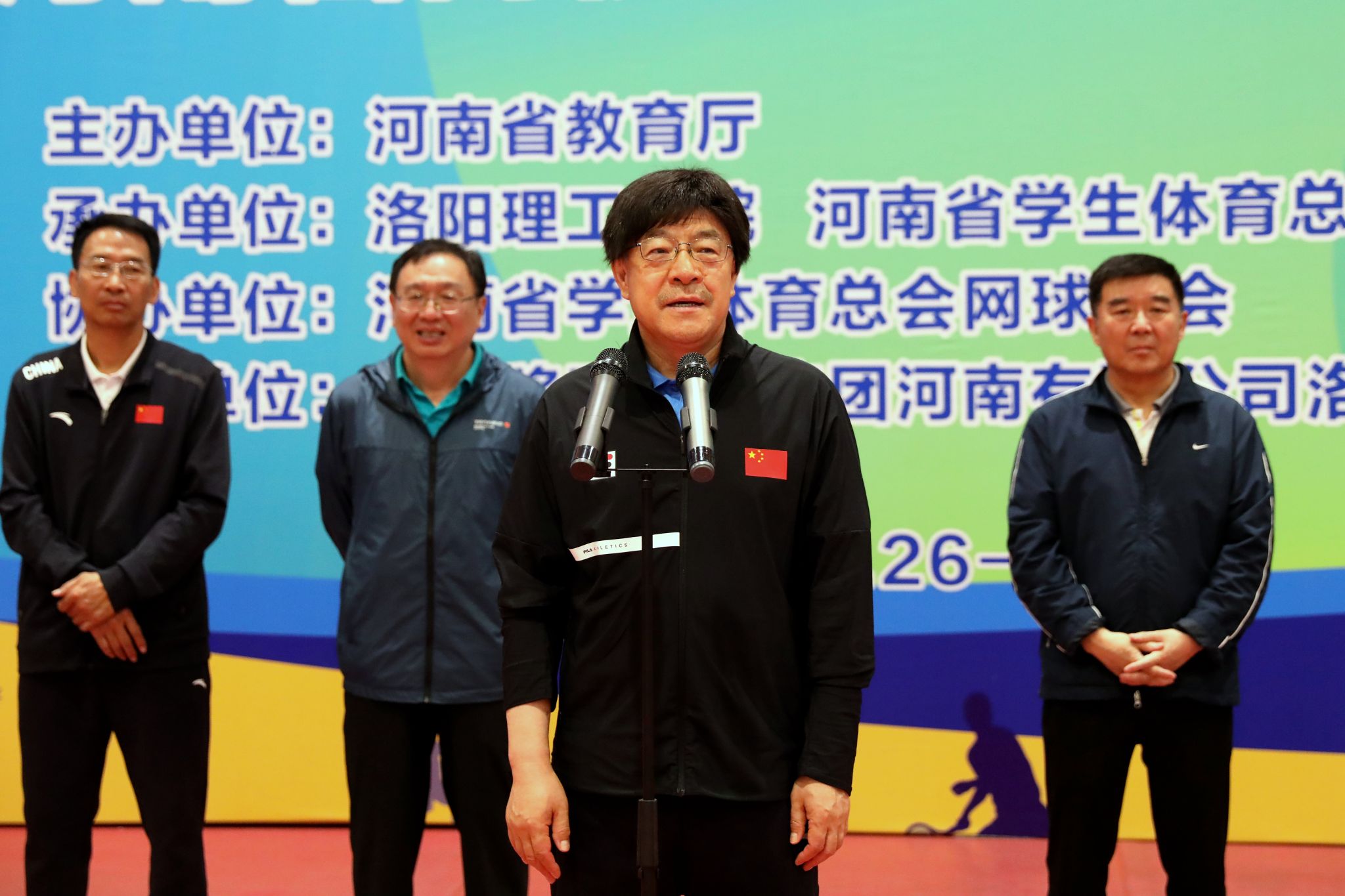 校长俞海洛,中国大学生网球协会副主席、河南省学生体育总会网球协会主席、原郑州大学党委副书记李兴成,河南省学生体育总会副主席、原河南科技大学党委书记孙金锋,河南省教育厅体卫艺处副处长高根立,中国移动通信集团河南有限公司洛阳分公司副总经理曹飞,美高梅娱乐场