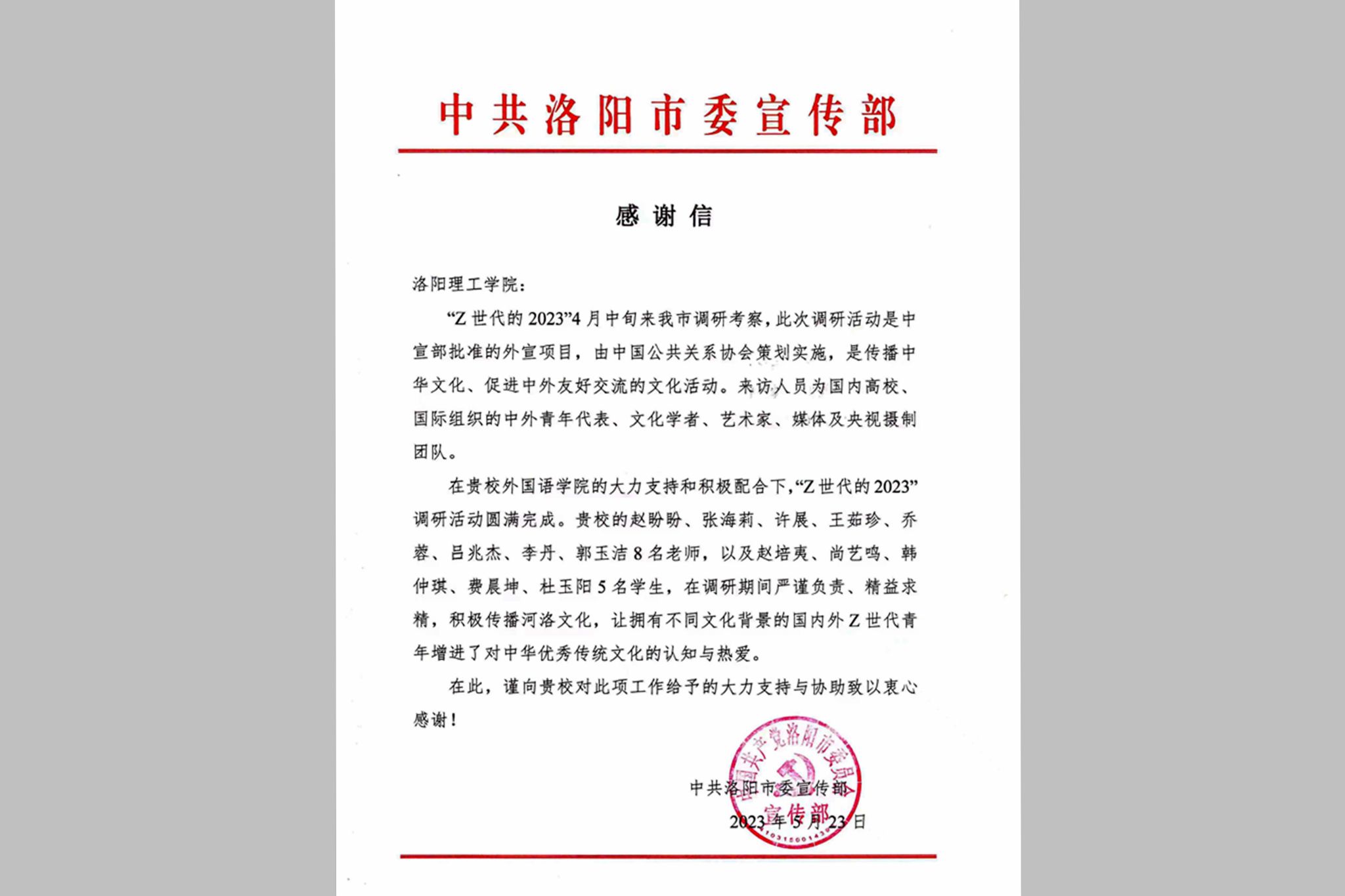 许展、李丹、张海莉等8名老师,以及赵培夷、尚艺鸣、韩仲琪等5名学生表示感谢,对他们在参与“Z世代的2023”调研活动期间严谨负责、精益求精的工作态度和积极传播河洛文化的热情表示肯定。