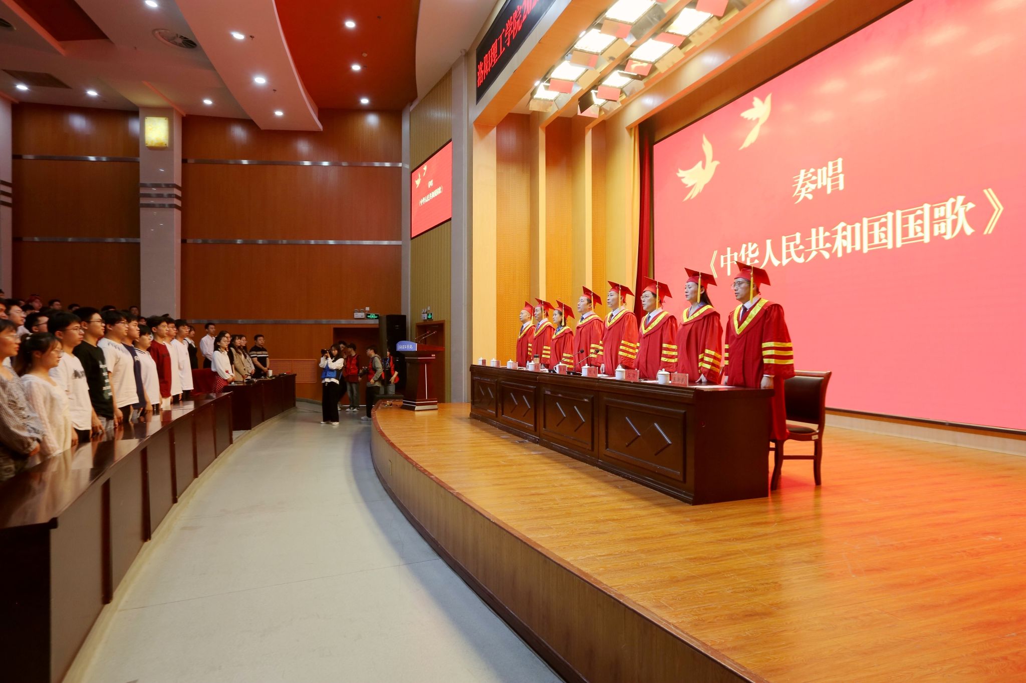 毕业典礼在雄壮激昂的国歌声中拉开帷幕。
