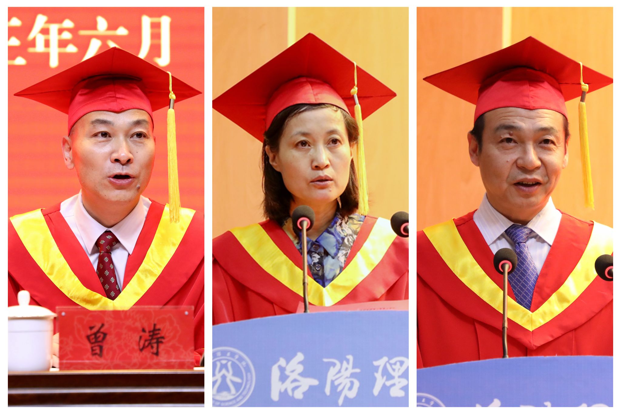 校党委副书记、工会主席曾涛(左)主持毕业典礼,副校长丁梧秀(中)介绍2023届毕业生毕业情况,副校长黄志全(右)宣读《美高梅娱乐场