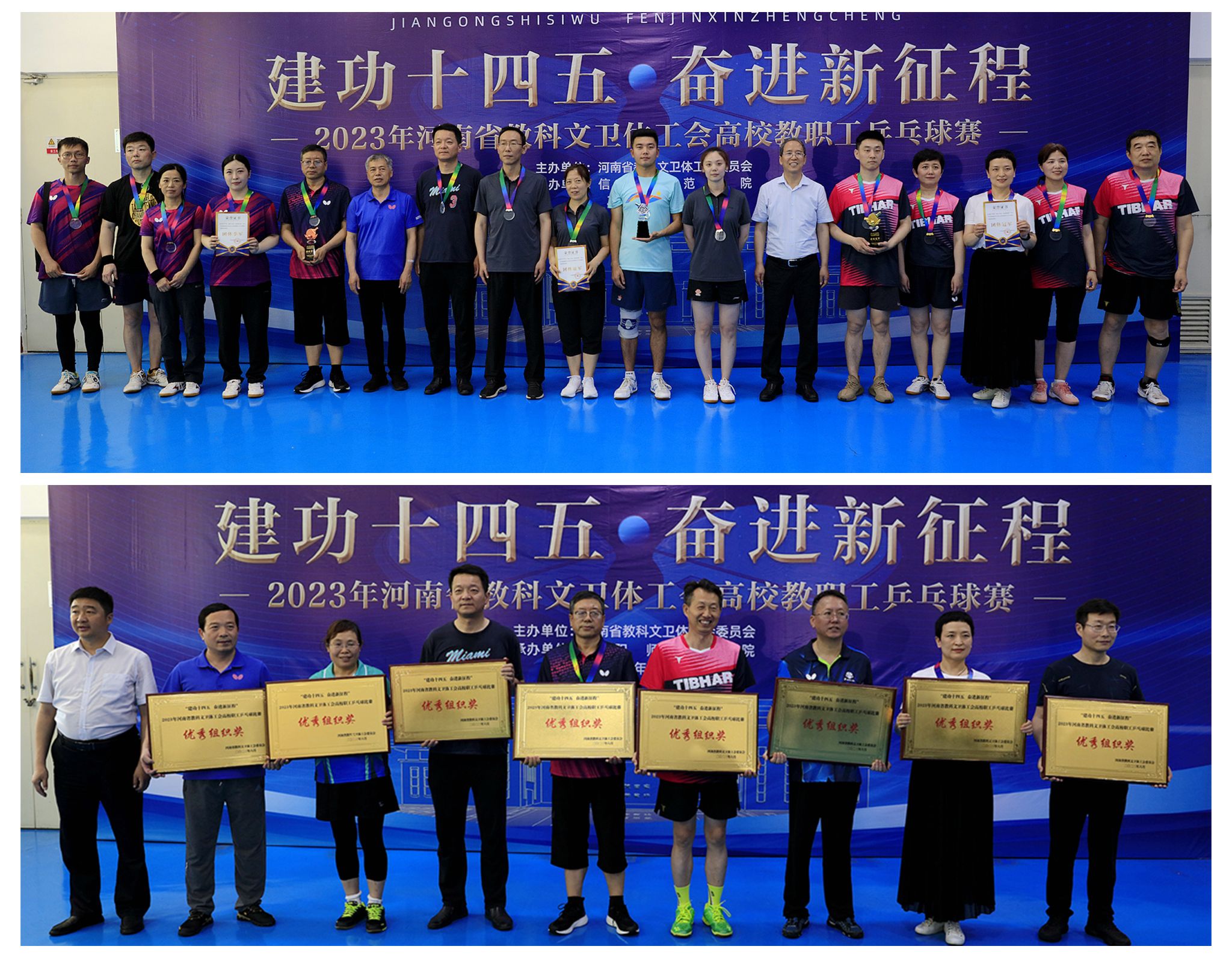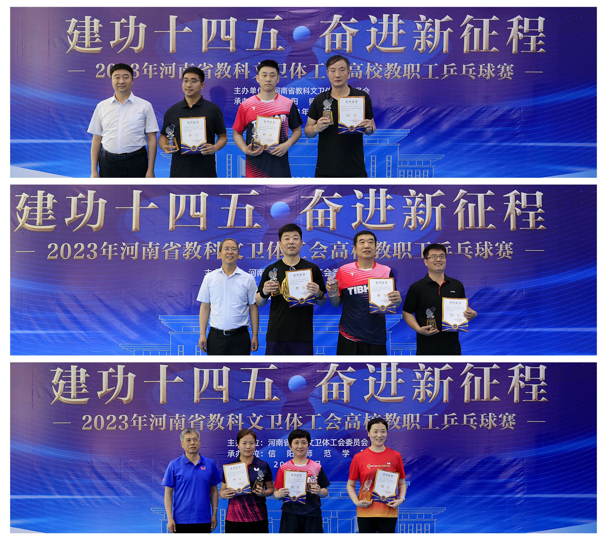 在2023年河南省教科文卫体工会高校教职工乒乓球比赛集体项目颁奖现场